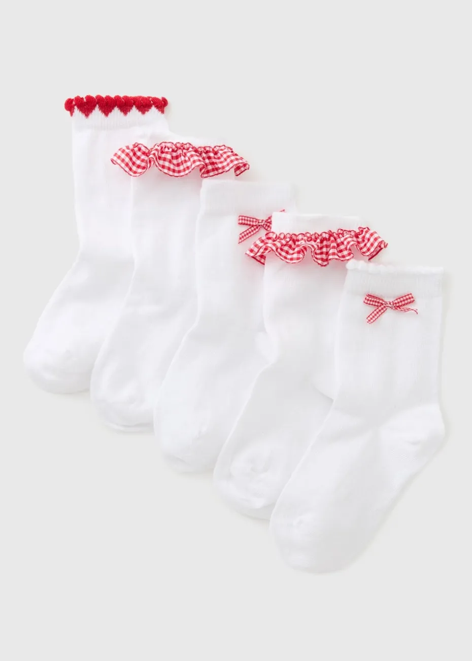 These soft cotton blend socks are the perfect finishing touch to your girls school uniform. In white, the five pack features red gingham bow and ruffle detailing to match her summer dress. Available in different colours to suit any dress code.