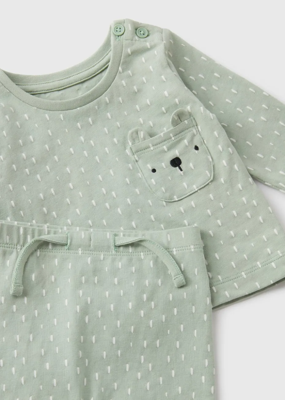 Dress your baby in ultimate comfort and style with our adorable Baby Sage Top & Leggings Set. This charming set is perfect for everyday wear and special occasions alike, featuring an all over pattern and a bear face to the pocket on the chest.