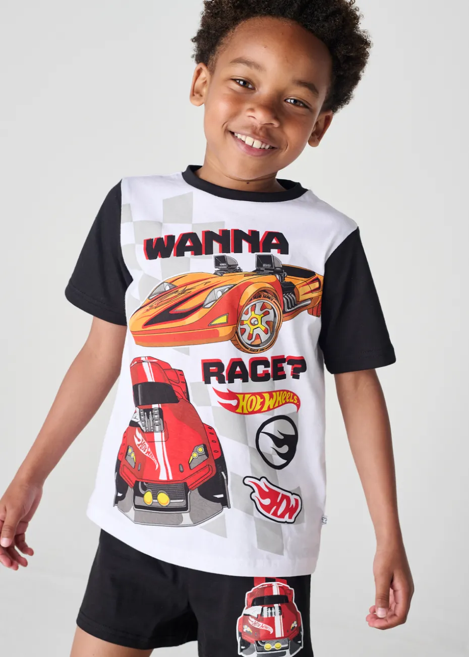 ev up for bedtime with this cool Hot Wheels pyjama set, perfect for young racing fans! Featuring bold car graphics and ‘Wanna Race?’ text, this set brings excitement to nighttime.
