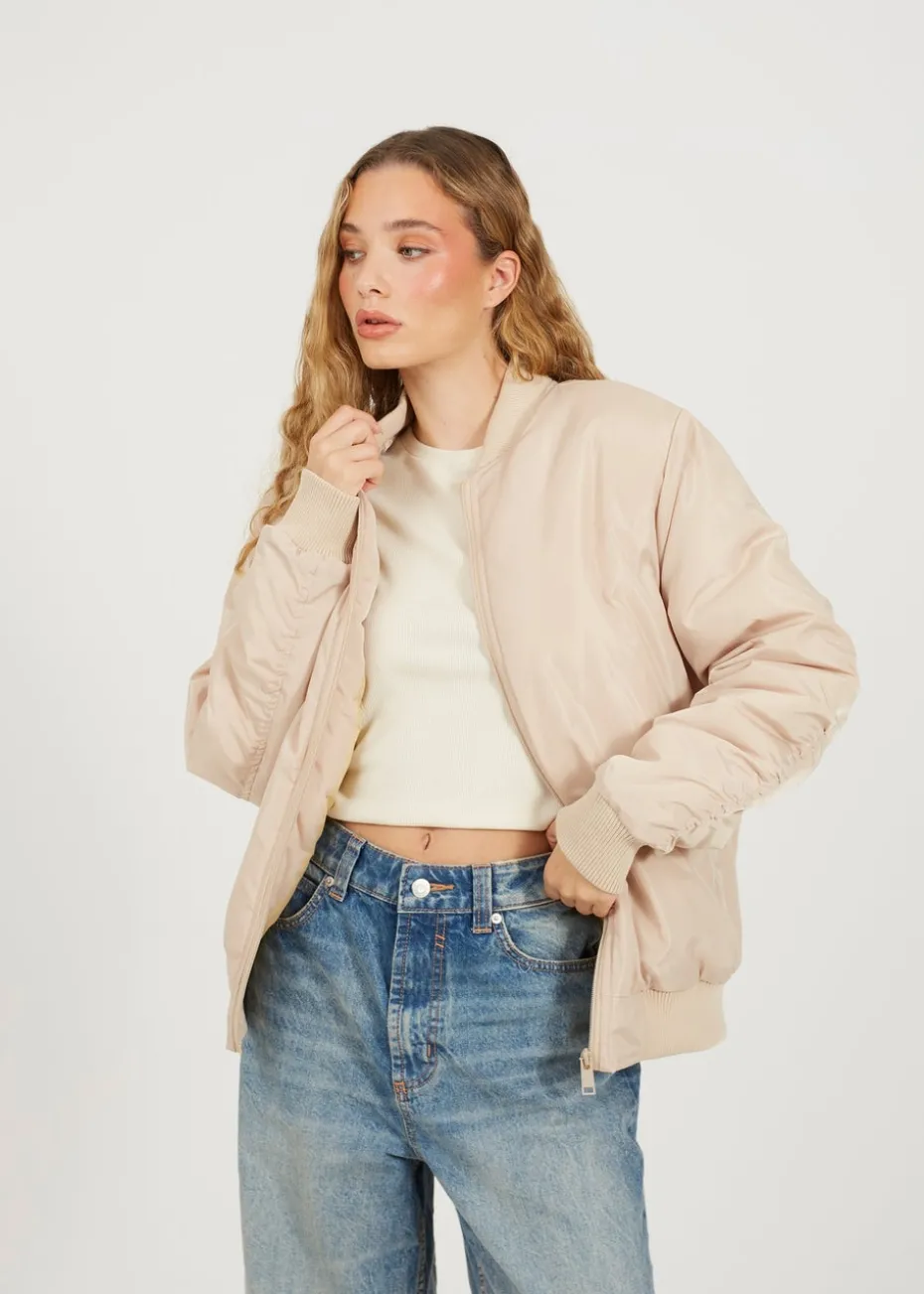 Brave Soul Stone Ruched Sleeve Oversized Bomber Jacket