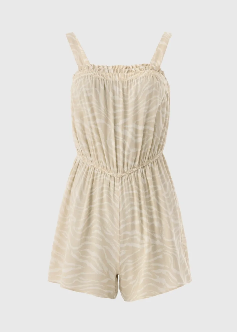 Our Animal Print Playsuit in brown, is the perfect summer playsuit for any occasion. This sleeveless piece is made from a lightweight woven fabric and features a beautiful animal print in a light brown and white. It has a relaxed fit with an elasticated waist, making it easy to wear all day long. Perfect for beach days, casual outings, or evening strolls with an extra layer.
