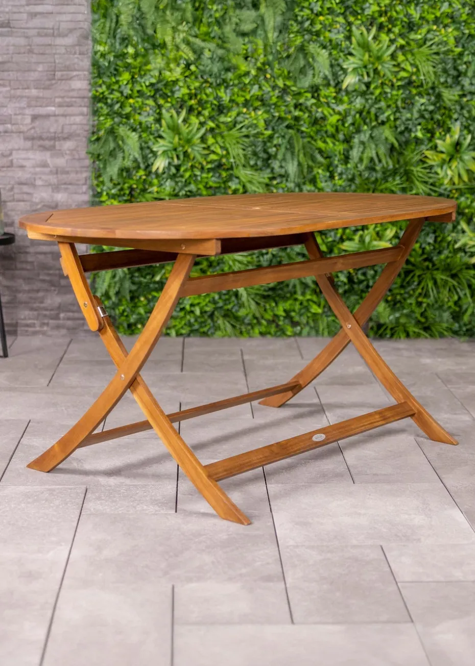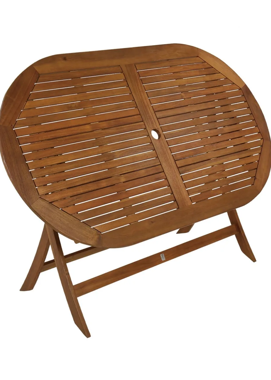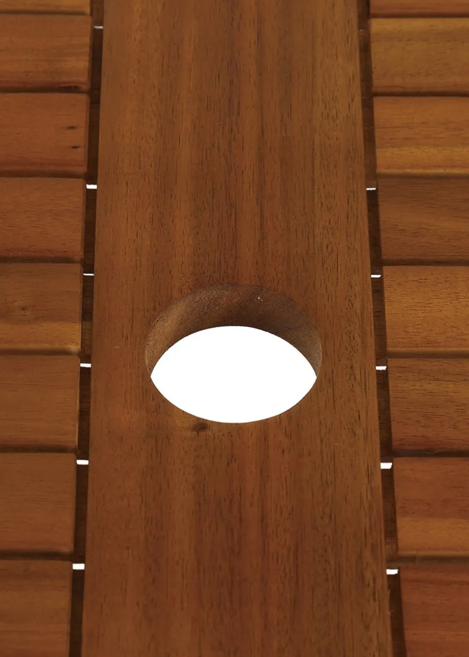 Our wooden oval table is a classic design that blends with any garden décor. The oval shape offers a spacious dining surface while the central hole allows for the addition of a parasol, providing shade on sunny days and ensuring a comfortable dining experience.