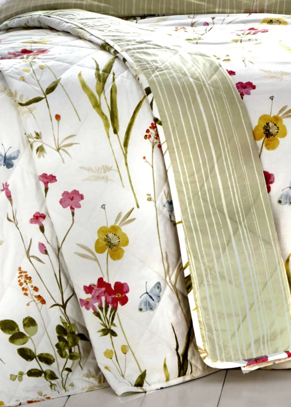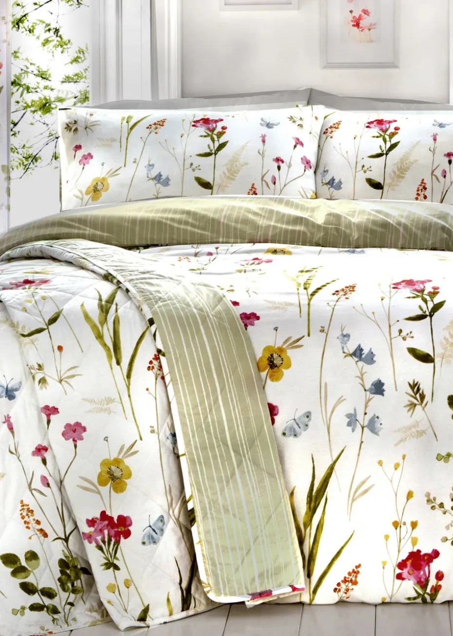 A hand painted delicate floral meadow with a fresh mix of bright spring colours, printed onto crisp easy care, polycotton white fabric. This vibrant bedspread will bring colourful warmth to your bedroom and is fully reversible with contrasting vertical green stripe. Complete the look with the matching ready-made pencil pleat curtains.