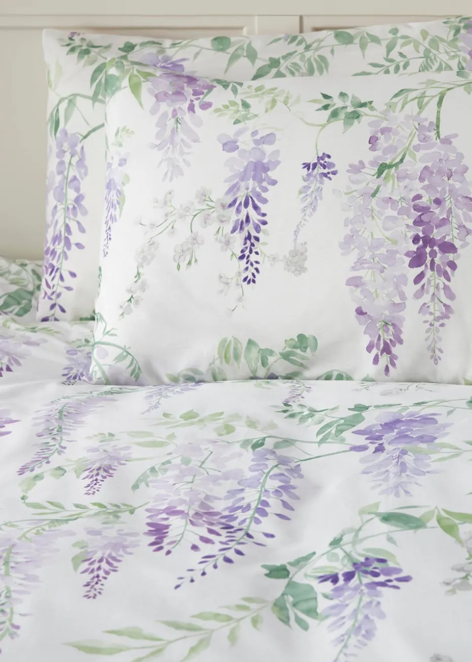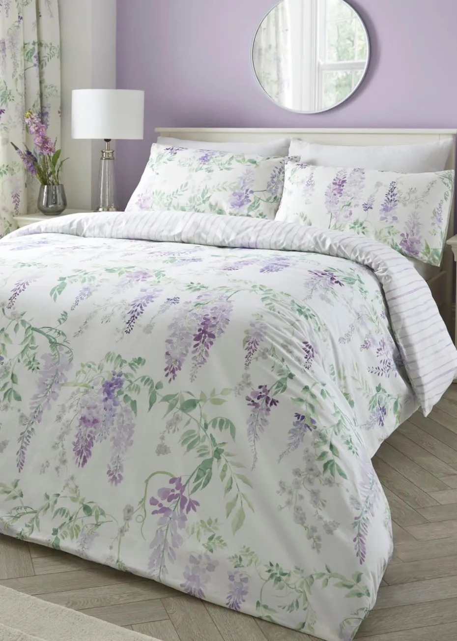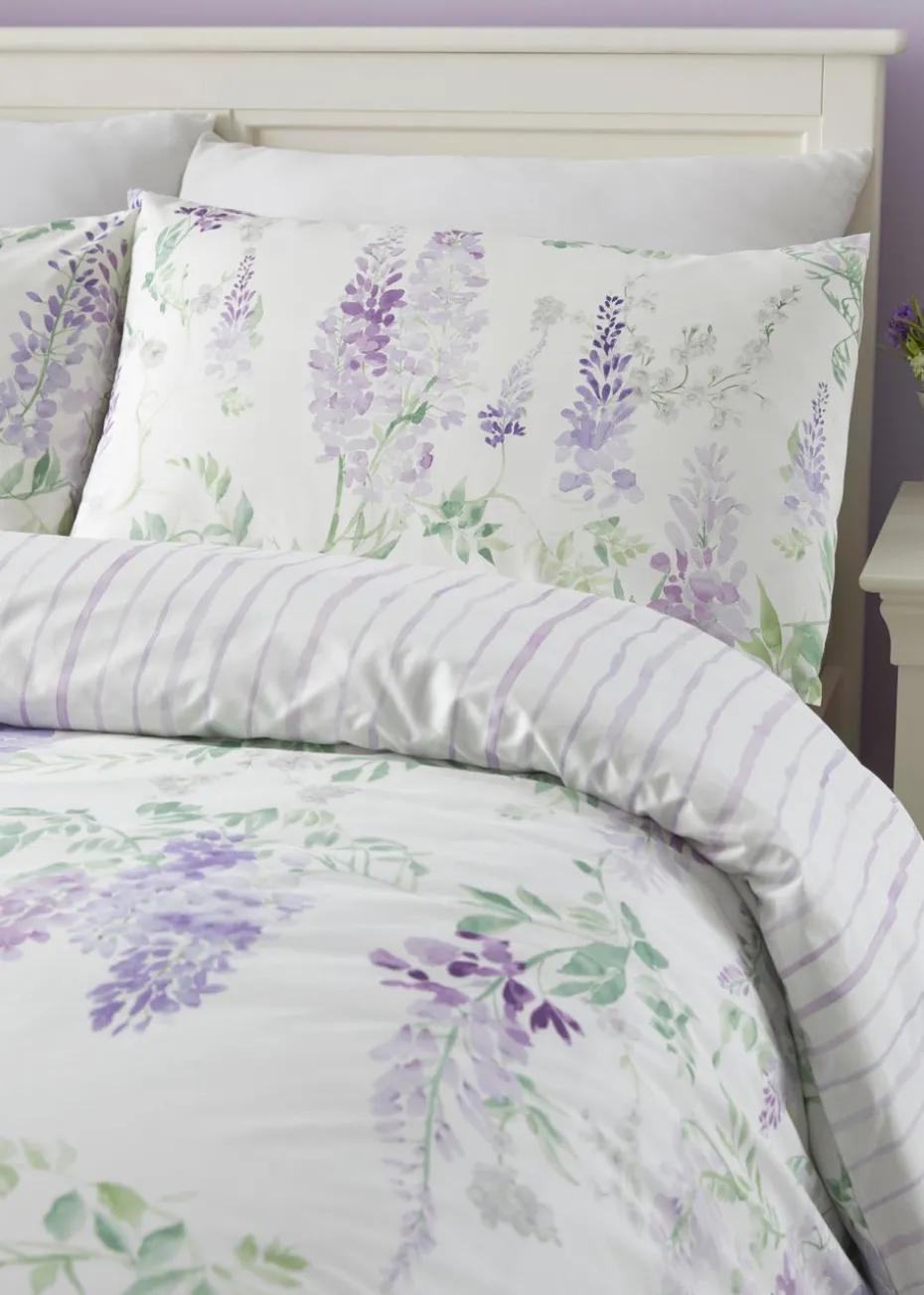 This gorgeous hand painted floral design is the perfect print to brighten up any bedroom. Lilac and lavender wisteria flowers adorn the front of the bedding on a soft white ground. The reverse of the duvet cover features a simple but stunning stripe in complimentary colours to offer two great looks for the price of one.
