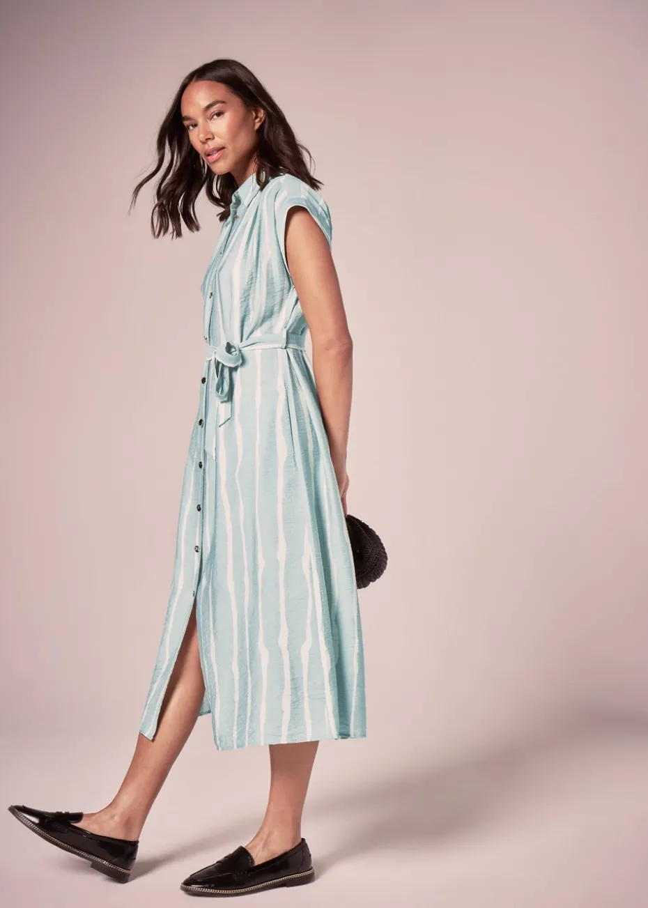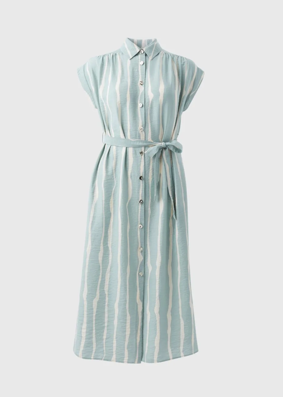 Refresh your wardrobe with the Et Vous Sage Stripe Midi Shirt Dress, a perfect balance of relaxed charm and refined style. Featuring soft sage green stripes and a flattering midi length, this dress is designed with a classic shirt collar, button-down front, and a self-tie waist to cinch and shape your silhouette. Crafted from lightweight, breathable fabric, it’s ideal for everything from weekday meetings to weekend brunches.