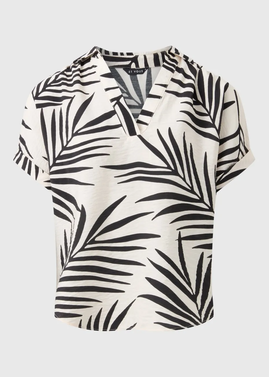Embrace effortless sophistication with the Et Vous White Palm Leaf V-Neck Top. Crafted from lightweight, breathable fabric, this top features a delicate palm leaf print that adds a subtle touch of tropical charm. The flattering V-neckline and relaxed fit make it perfect for both casual days and dressier occasions. Pair it with tailored trousers or your favourite jeans for an easy, chic look that transitions seamlessly from day to night. Elevate your workwear with tailored trousers and pointed-toe heels.