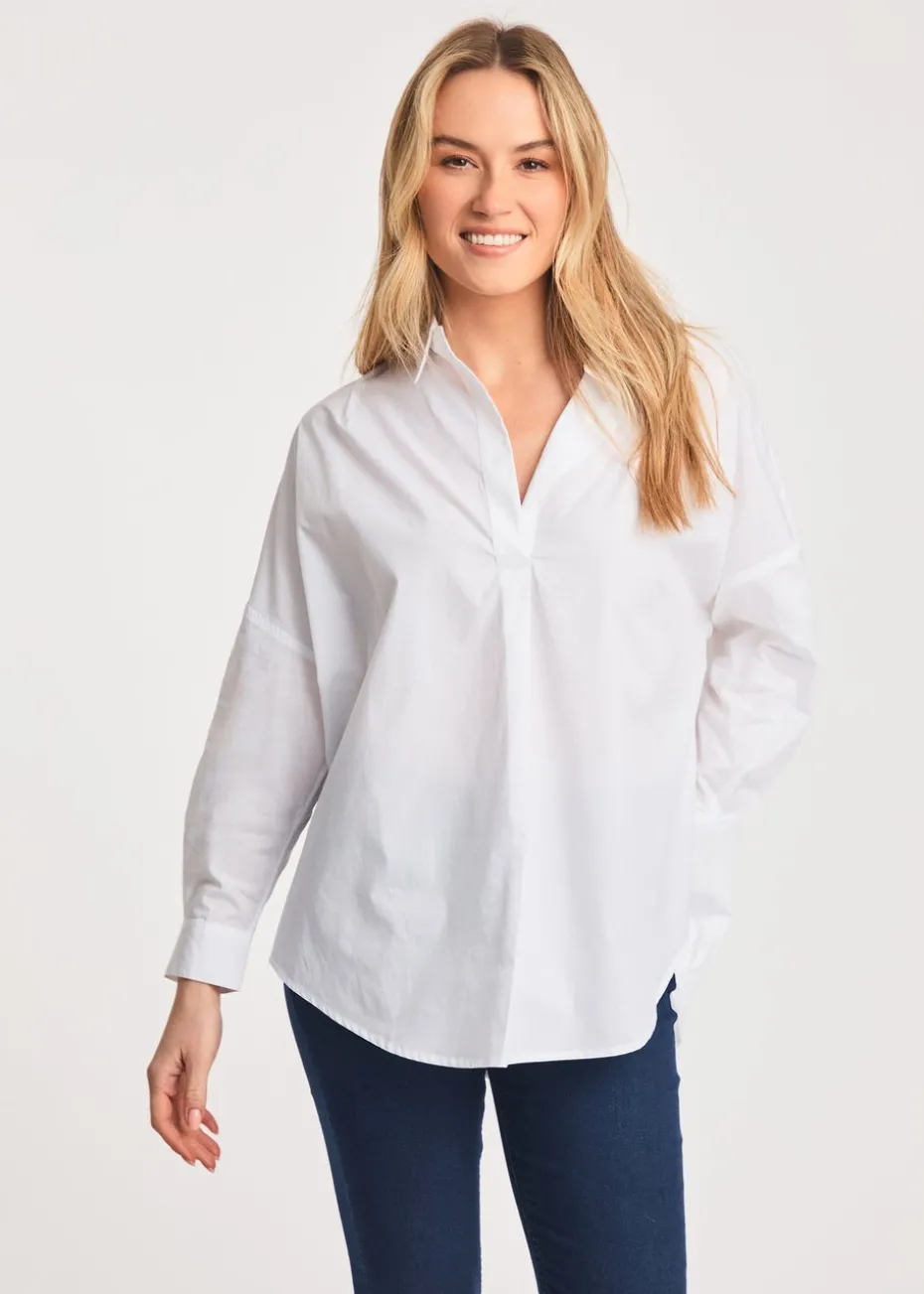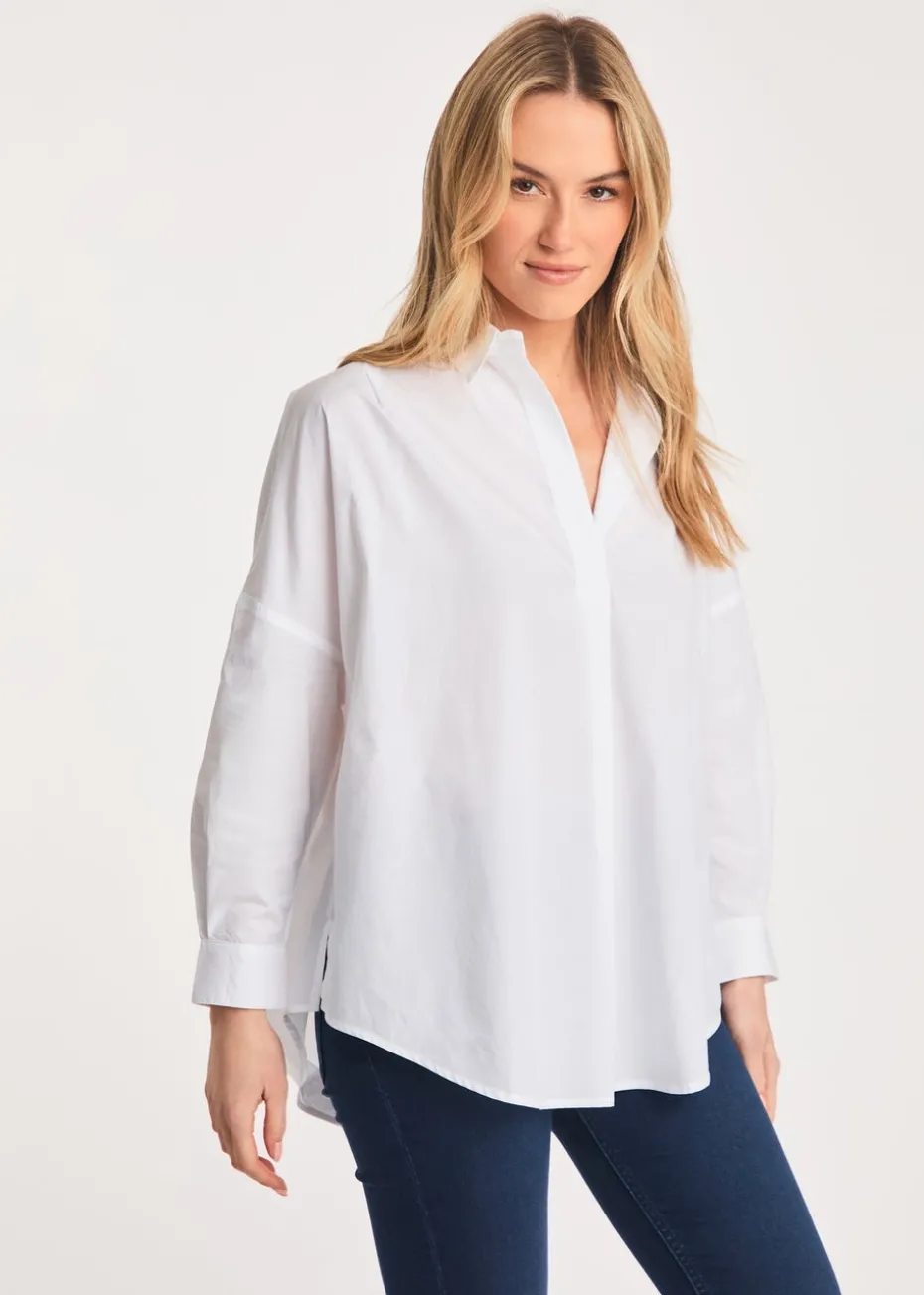 French Connection White Cotton Long Sleeve Poplin Popover High-Low Hem Shirt