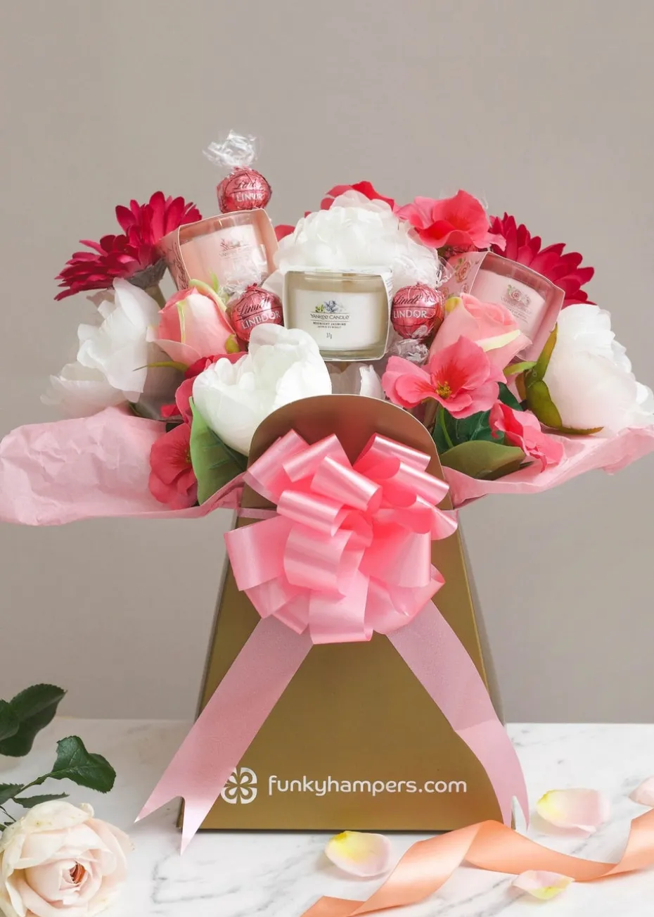 Our exclusive Pretty in Pink Chocolate and Yankee Candle Bouquet is a unique gift featuring a selection of amazing candles. Our exclusive range of Yankee Candle bouquets make ideal gifts for all occasions. Discover the latest fragrances to make your home smell amazing with this hand picked range of scented candles. This selection of Yankee Candles is presented with luxury silk style roses and other treats to make an amazing gift. These amazing scented candles are hand made into a beautiful bouquet. Extra care is put into the packaging of our bouquets to ensure they arrive in pristine condition. Your bouquet will be elegantly arranged by hand and presented inside a gift box with a bow. This is then placed inside a sturdy box for safe delivery. Our Funky Bouquets are all hand made to order using silk flowers which last forever and unlike other companies, all of our delicious chocolates and gifts are secured on platforms and not pierced so are fully edible and fresh as can be. Each Yankee Candle Bouquet contains the following. 1 x Clean Cotton Yankee Candle Votive 1 x Midnight Jasmine Yankee Candle Votives 1 x Pink Sands Yankee Candle Votives 2 x Fresh Cut Roses Yankee Candle Votives 2 x Pink Silk Roses 5 x Pink Silk Daisies 4 x White Silk Peonies 4 x Lindor Strawberries and Cream Truffles Please note, we sometimes have to switch the design of some of the products shown within the image. When this happens we use very similar items. ALLERGY ADVICE This product contains the following allergens. MILK, SOY