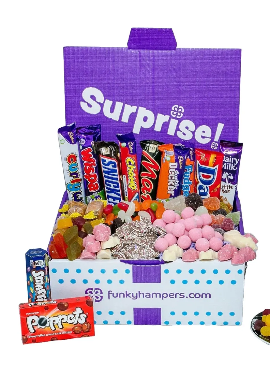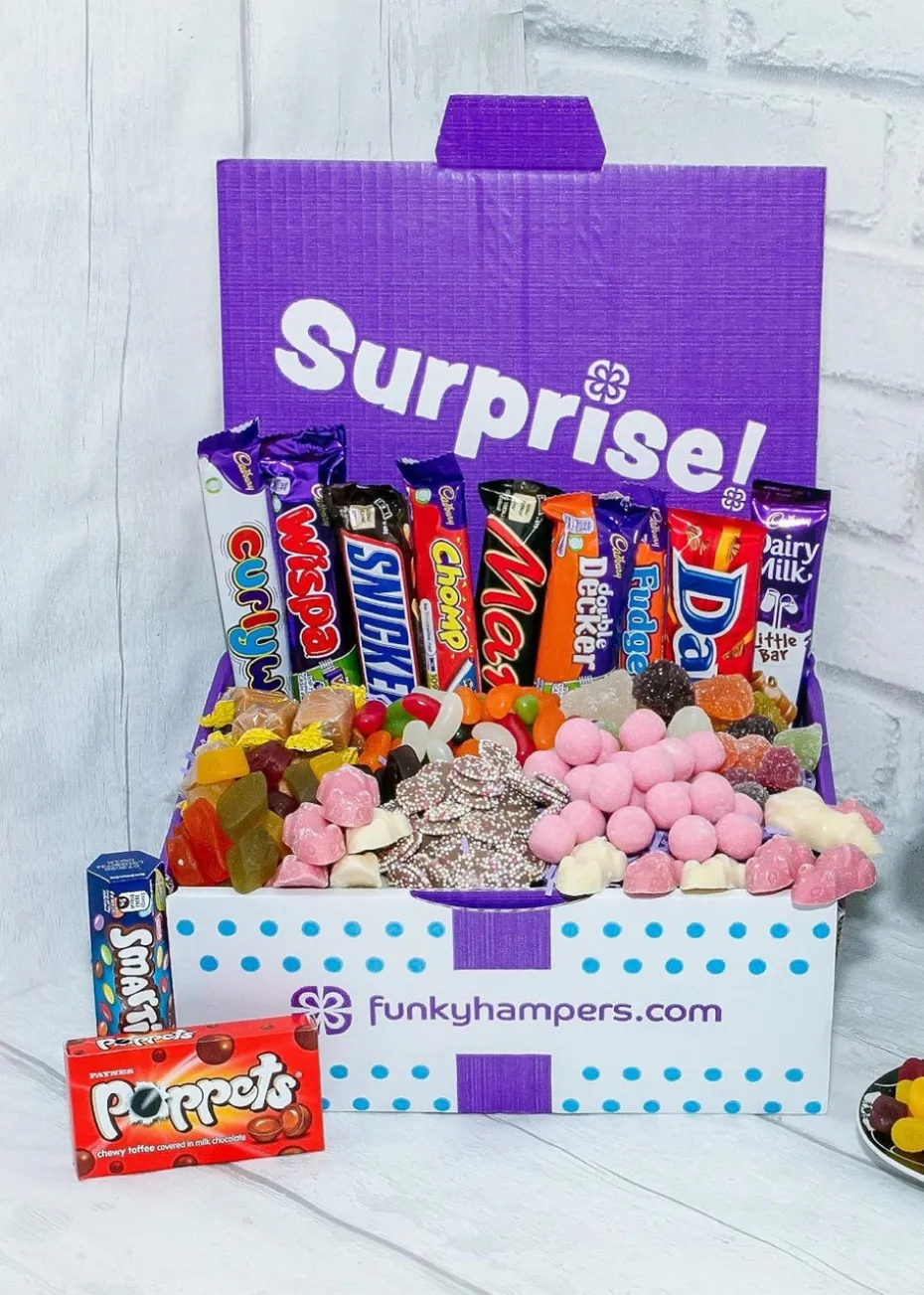 All sweets and chocolates come individually bagged Packed with classic retro sweets and chocolates Presented in a gift box Includes Free Personalised Greetings Card. Our Tuck Boxes all come beautifully packed. The sweets are sealed in individual sweet bags. They are then packaged in tissue paper inside a white box. Contains Crunchie Smarties Fudge Double Decker Chomp Curly Wurly Dairy Milk Mars Bar Maltesers Wispa And 12 portions of classic retro sweets Please note that it is sometimes necessary to substitute items with a suitable equivalent. May contain milk, nuts, eggs, Soya. Product Expiry Date. Minimum 6 Months. ALLERGY ADVICE This product contains the following allergens. MILK, GLUTEN, EGG, SOY, PEANUTS