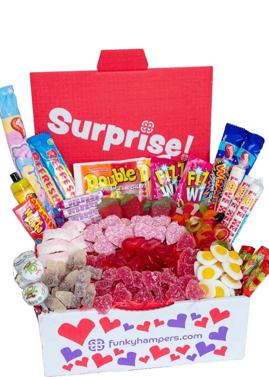The Sweet Love Box is the perfect gift to show that special someone exactly how you feel. All sweets come individually bagged Packed with romantic themed sweets Presented in a love themed gift box The Sweet Love Box is a great gift to show that special someone exactly how you feel. There are five portions of love related sweeties, including Love Hearts, Jelly Hearts and Jelly Lips We also include another eighteen different portions of sweets from our retro range which can include classics such as Cola Bottles, Wham Bars and Flying Saucers. Presented in a love heart gift box, this makes a great gift for Valentine’s Day, Anniversary or just to show that you care. Contents Include 100g x Sweet Kisses 2 x Packets Of Love Hearts 100g x Foam Jelly Love Hearts 100g x Red Jelly Lips 100g x Rings 2 Wham Bars 1 Refresher Pack 2 Popping Candy 1 Giant Parma Violets 1 Double Dip 1 Flump 3 Strawberry Cables 100g Teeth 1 Giant Fizzers 100g Jelly Beans 1 Sherbet Fountain 2 Refresher Bars 4 Double Lollies 10 Fried Eggs 3 Drumsticks 8 Strawberries 100g Cola Bottles Please note. The box and tissue paper colour may differ from the red shown. Please note, we sometimes have to switch some of the products shown within the image. When this happens we use very similar items. ALLERGY ADVICE This product contains the following allergens. MILK, EGG, SOY