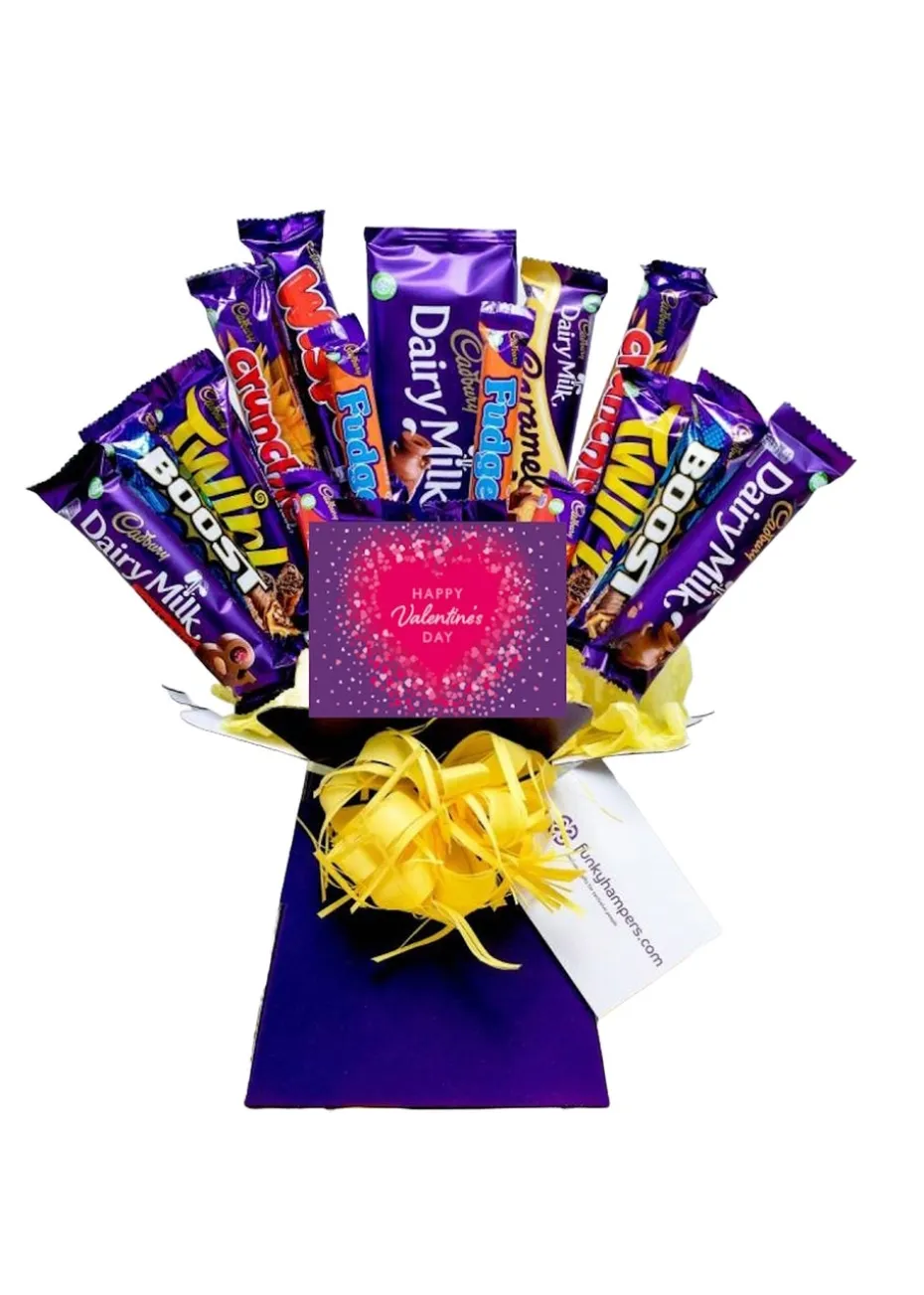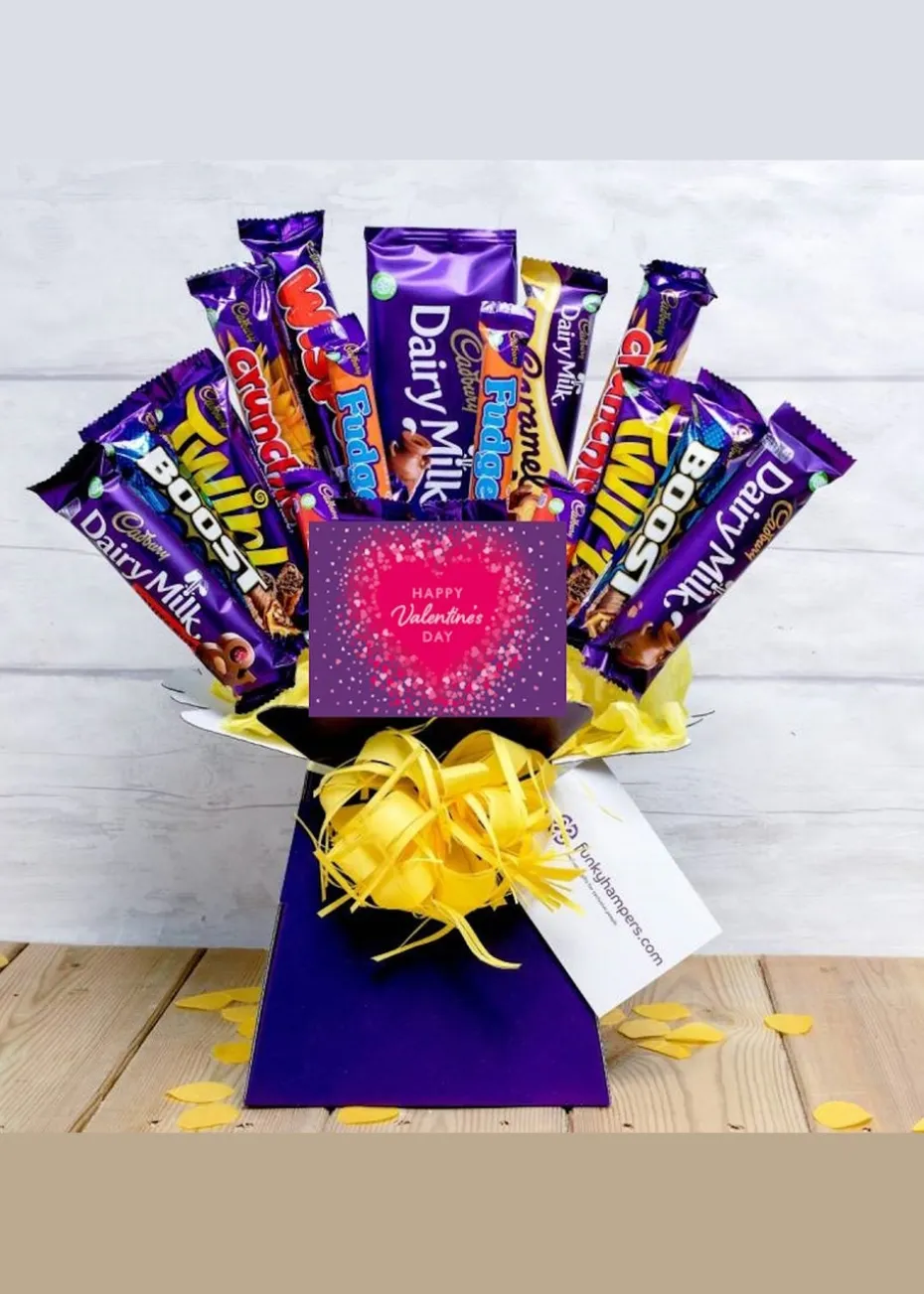 Valentines Day Card Wispa Dairy Milk Dairy Milk Fruit n Nut Dairy Milk Caramel 2 x Boost 2 x Twirl 2 x Crunchie Dairy Milk Big Bar 95g 2 x Fudge 2 x Freddo 2 x Chomp