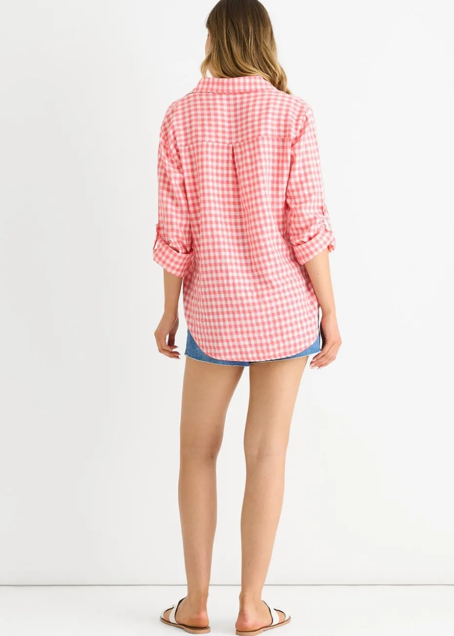 Gini London Coral Cotton Gingham Roll Up Sleeves Oversized Tie Top