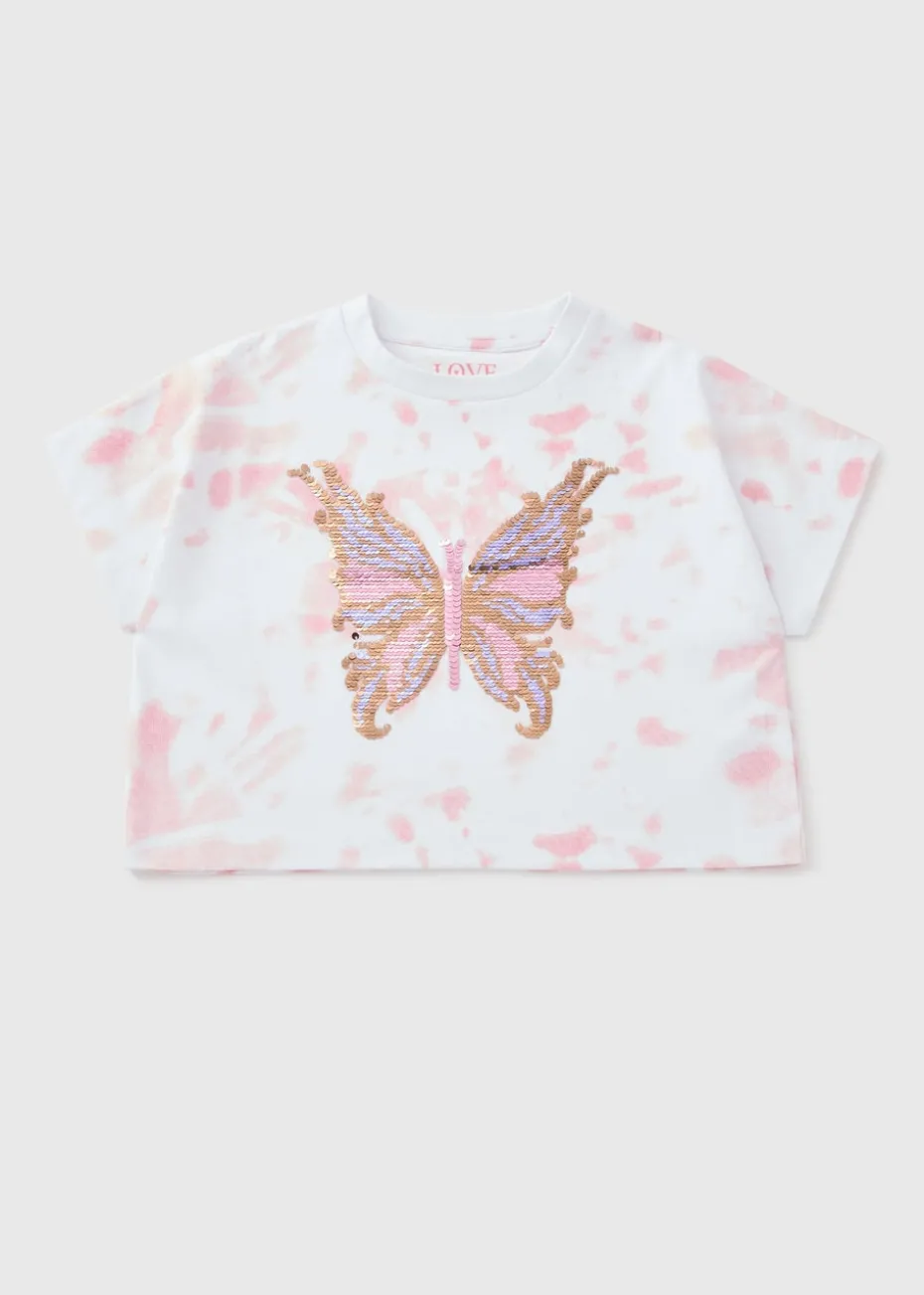 Let your little one spread their wings and fly high in style with our enchanting Girls Pink Tie Dye Butterfly T-Shirt! This vibrant tee, crafted from a soft cotton blend, will bring a pop of colour and a dash of whimsy to their wardrobe.