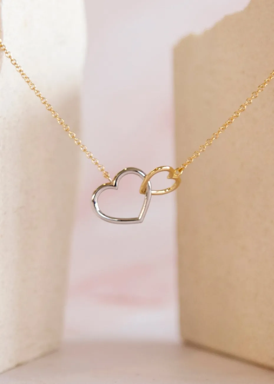 Crafted from 9-carat gold, the necklace features two-colour gold hearts that are intricately interlocked, creating a beautiful and meaningful design.