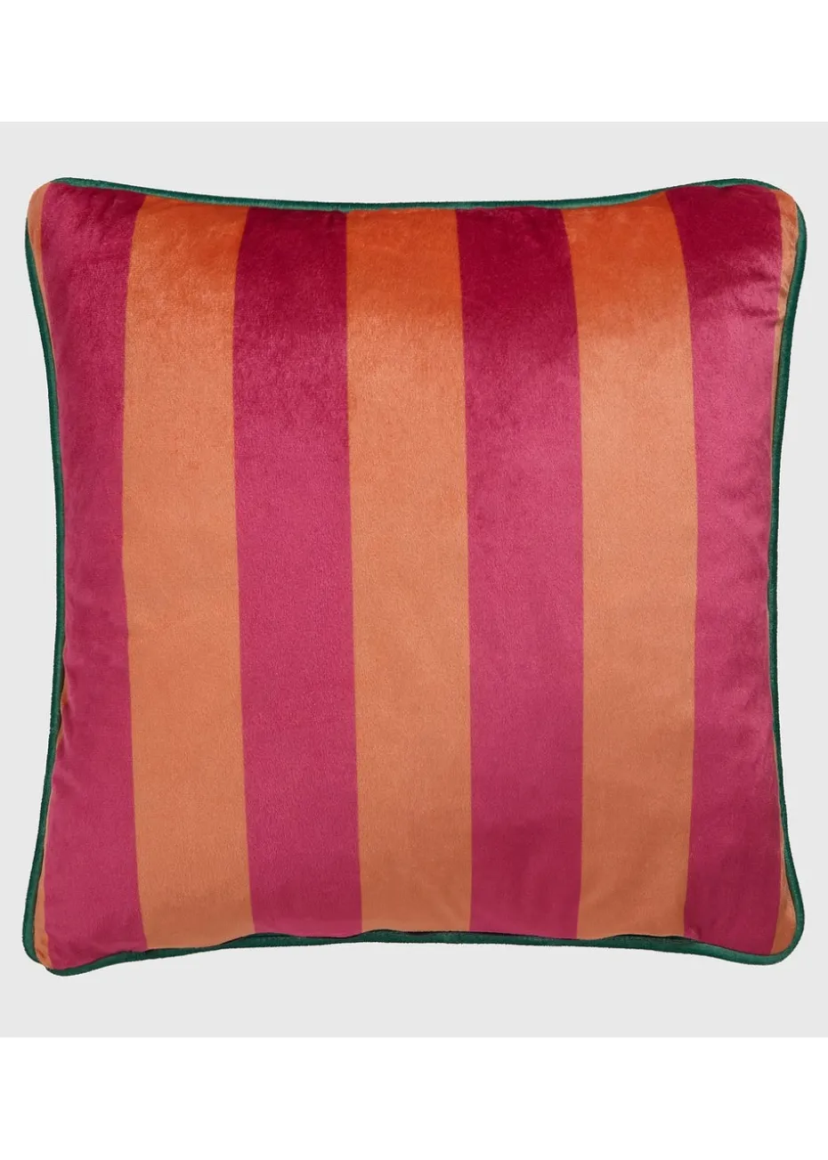 Indulge in the opulent whimsy of the Cotswold Fantasia Dawn cushion by Lawrence Llewelyn-Bowen. Enrobed in sumptuous bold pink velvet adorned with a bright rose and floral motif, this cushion exudes unparalleled luxury. The reverse features an enchanting orange and pink striped design, complemented by elegant teal piping.
