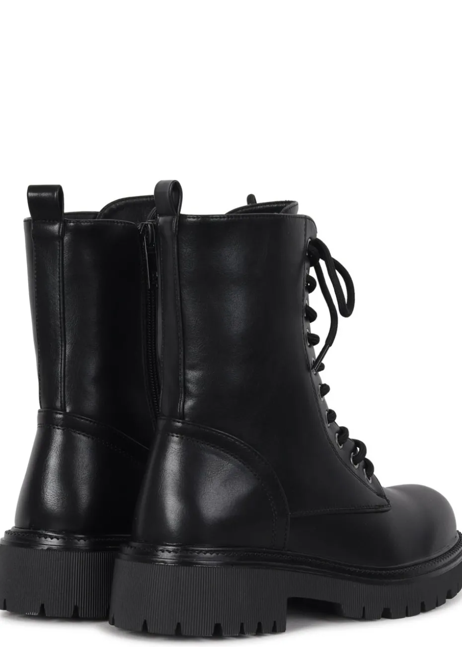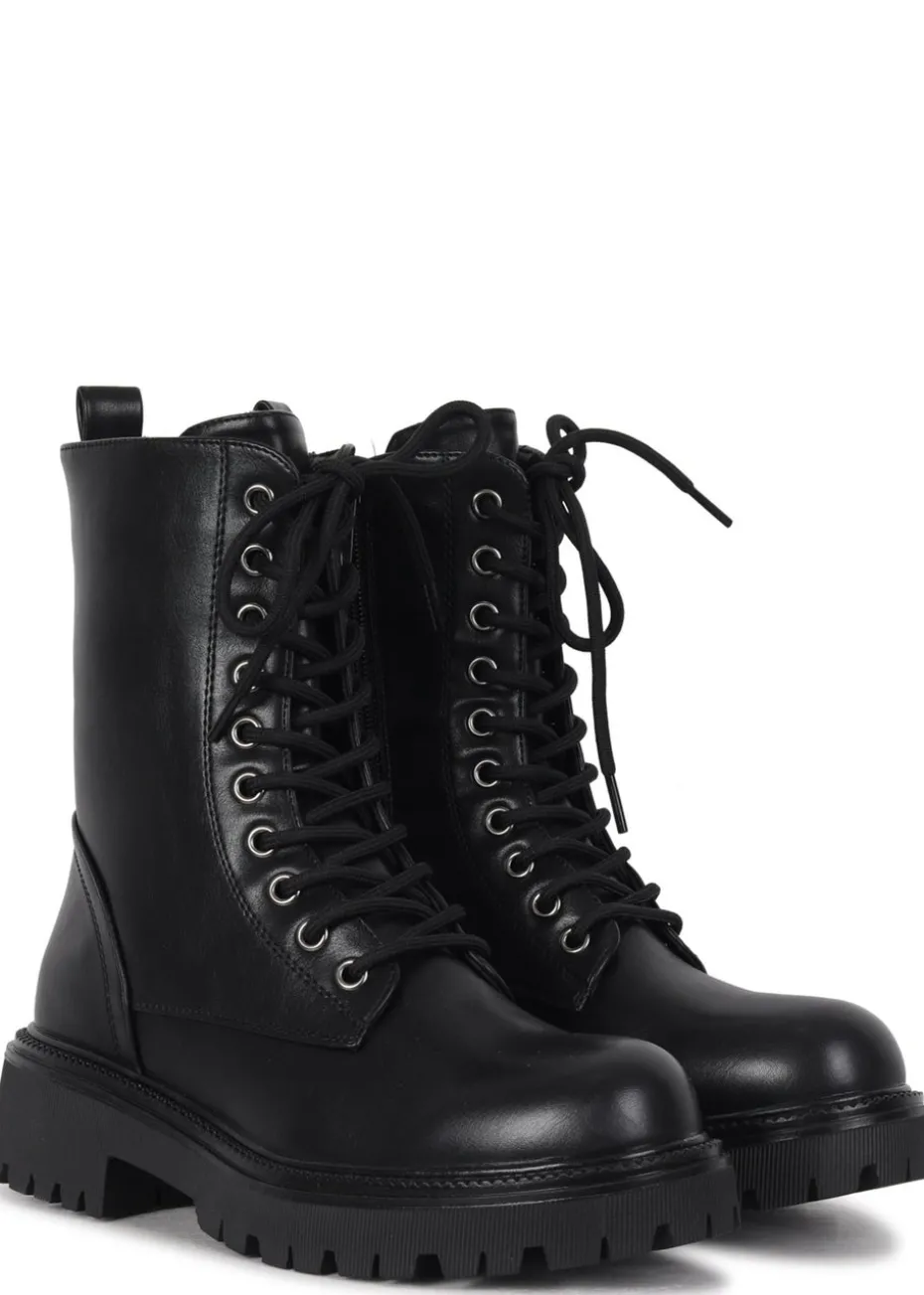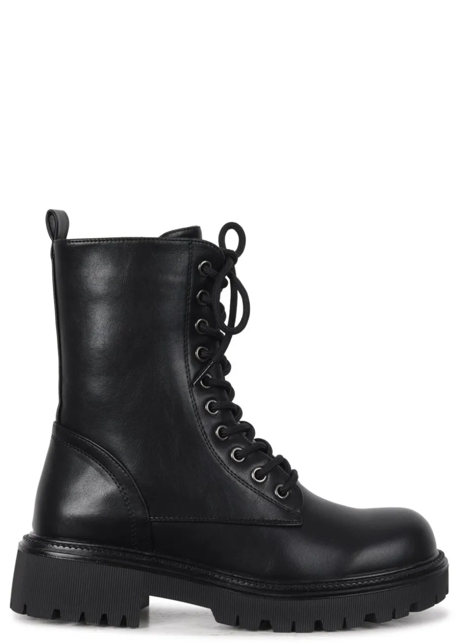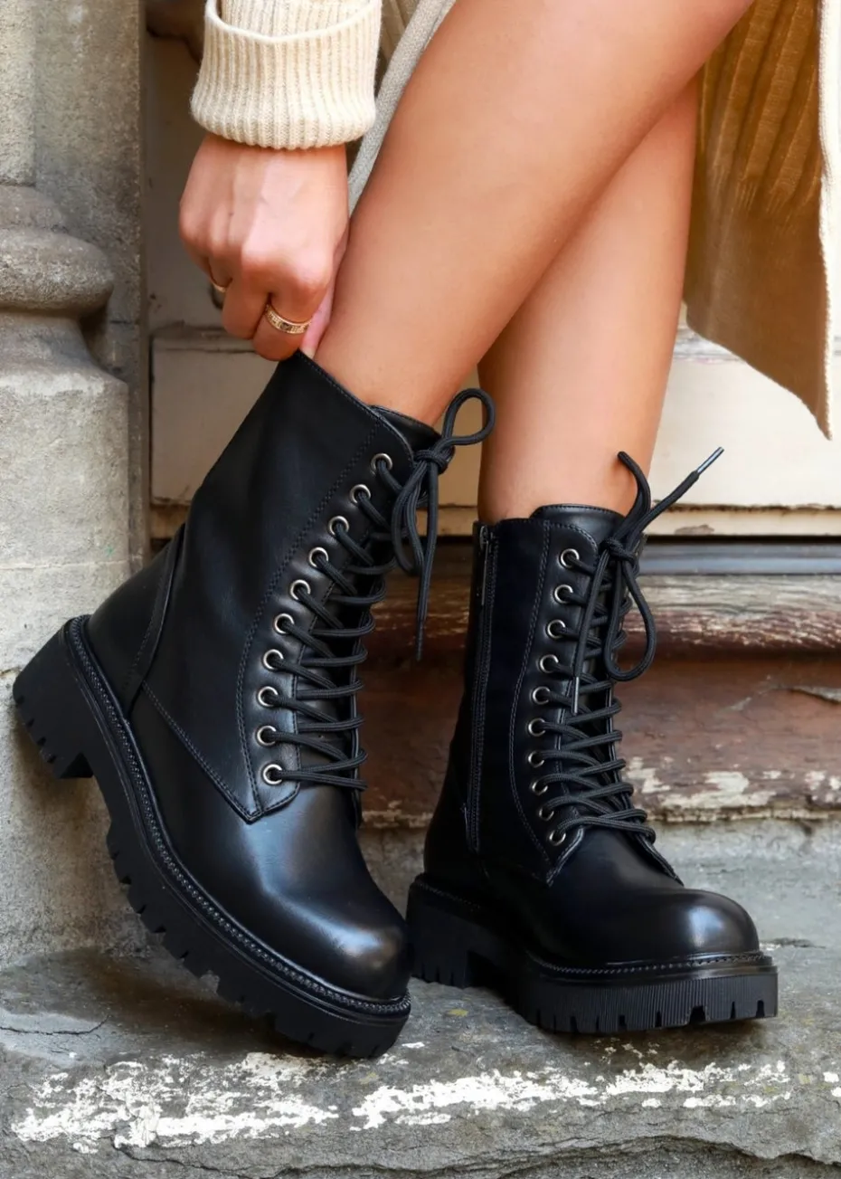 Tackle any terrain in style with these soft faux leather lace up military boots, featuring gunmetal eyelet detailing, full length side zip, and a fearless chunky sole.
