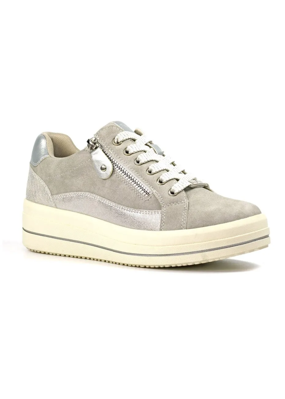 Introducing the Medway trainer. Featuring a light grey upper with metallic silver accents, complemented by a zip detail for added flair. The platform sole provides extra height and comfort, while the lace-up design ensures a secure fit. Perfect for casual outfits with a modern, chic touch.
