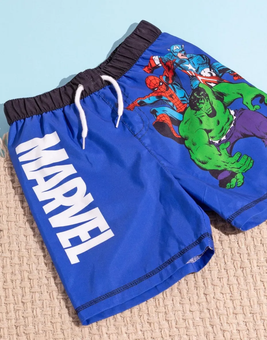 Swim in style with their favourite superheroes! The vibrant blue trunks are perfect for a day at the beach or pool and they’ll love showing off their favourite Marvel characters including the Hulk, Spiderman and Captain America. The elastic waistband ensures a comfortable fit while the mesh lining offers added breathability. They are made from fast-drying polyester for a light and comfortable feel. The swimming shorts are available in sizes 3-4 years, 4-5 years, 5-6 years, 6-7 years, 7-8 years, 8-9 years, 9-10 years and 10-11 years. Whether he’s splashing around in the water or just lounging on the sand, he’s sure to have a blast in these Marvel swim shorts! Take Care Of Me – We really want to ensure you experience the longest life with your product, so please wash inside out at 40°C with similar colours, rinse well in cold water immediately after use and dry away from direct sunlight.
