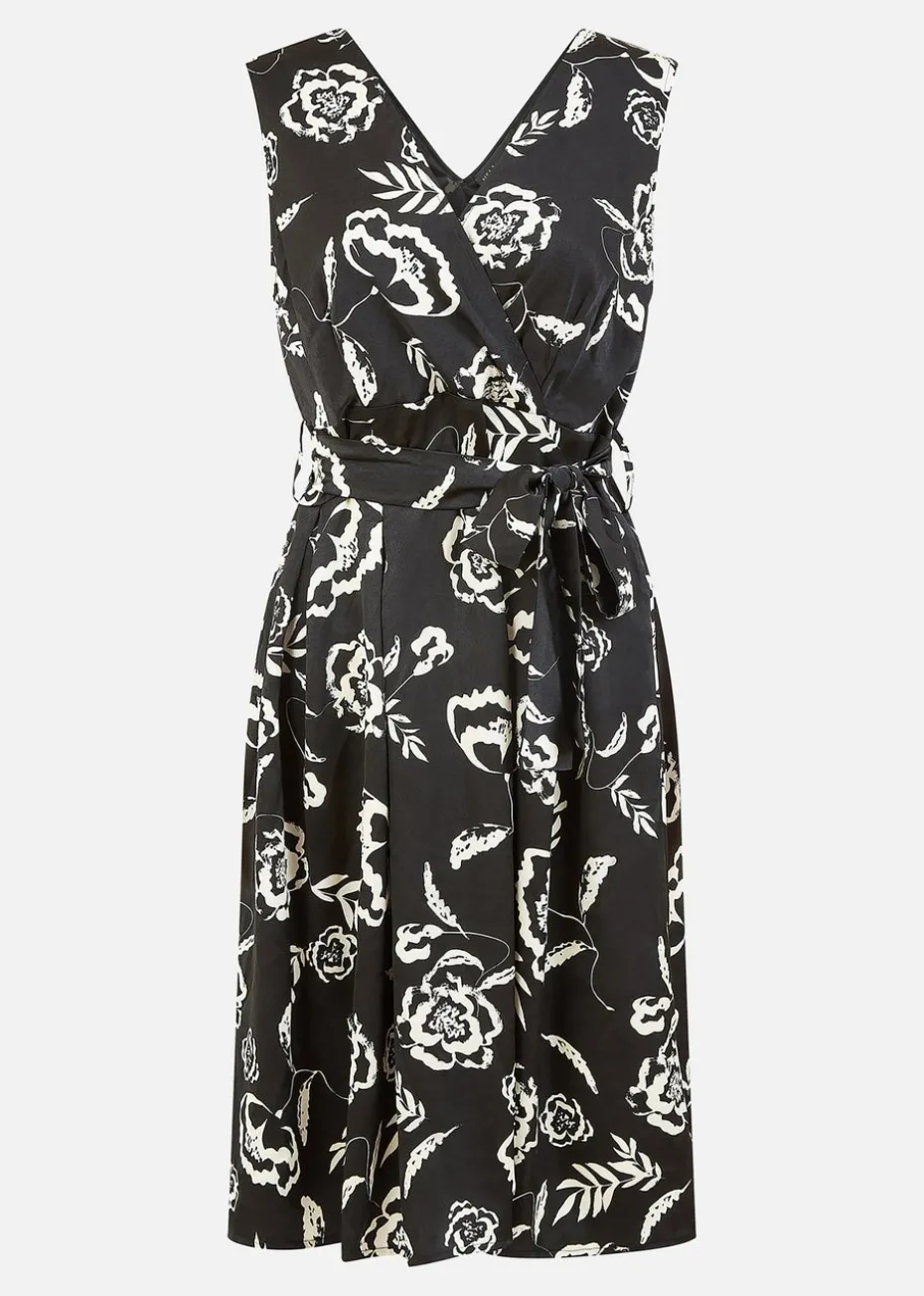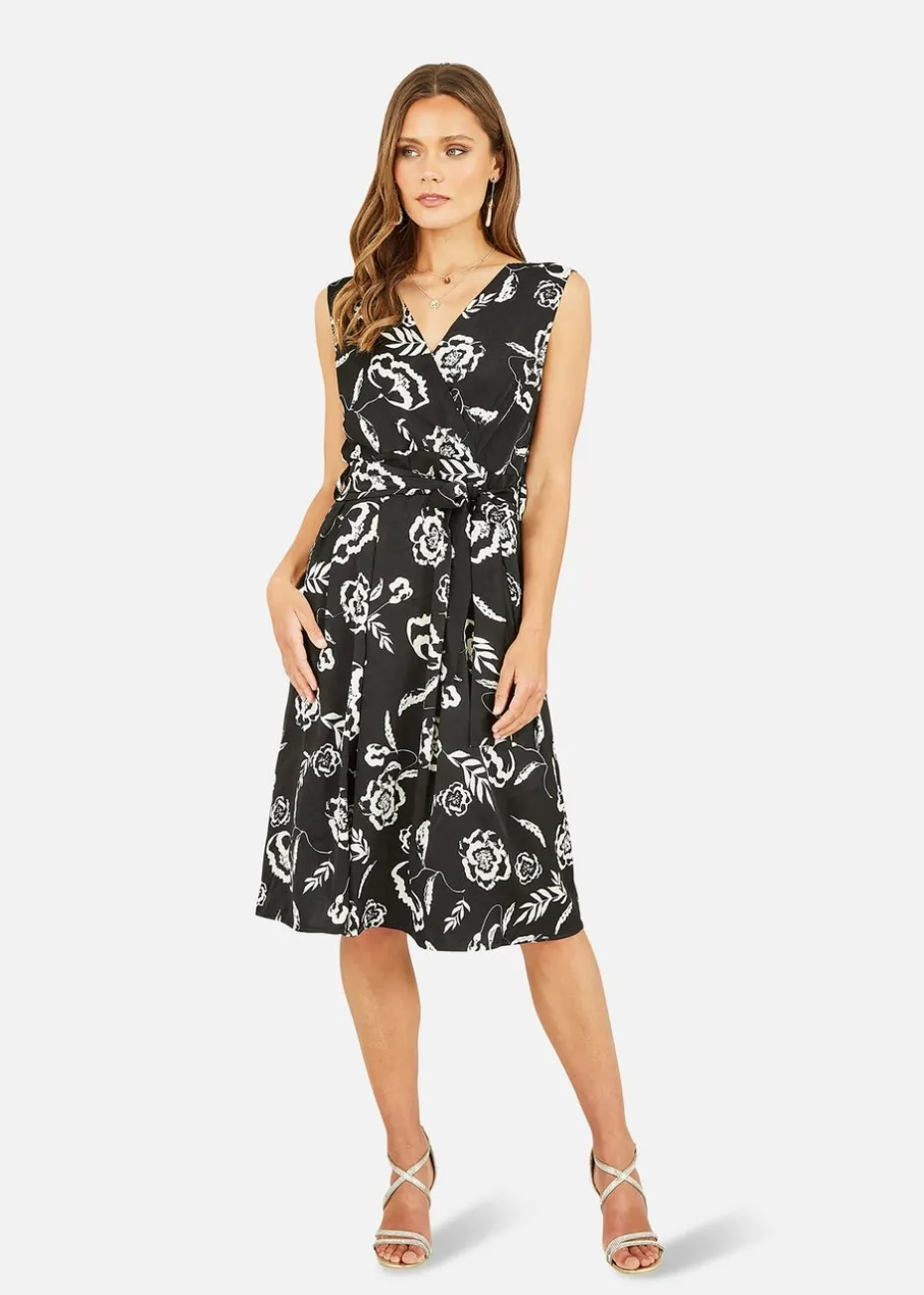 Sophisticated florals for your winter wardrobe in this stunning skater style dress from Mela. With a wrap over neckline, self tie belt and all over print on soft and silky satin. We love this styled with a black bolero and heels for wedding and party invites.