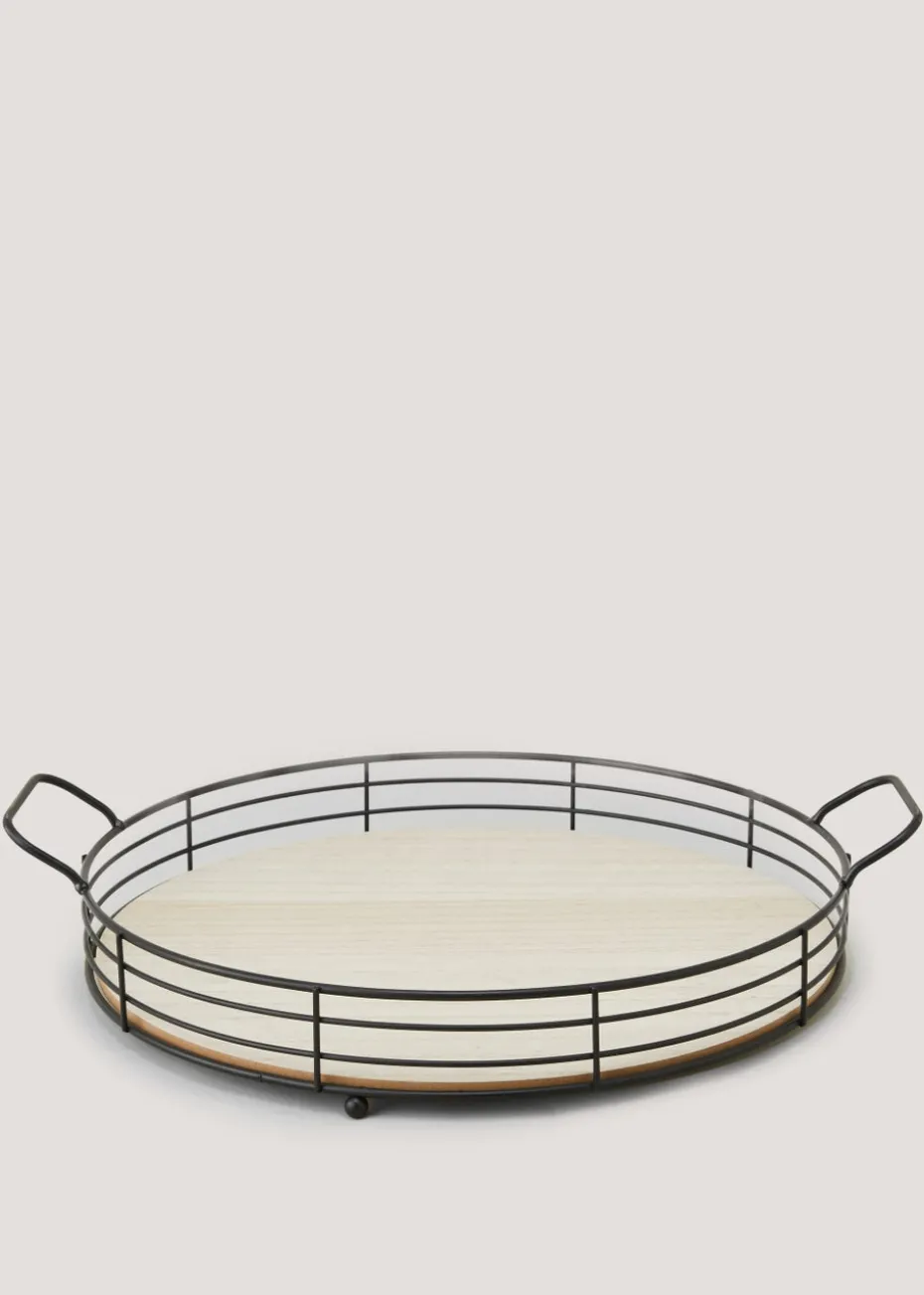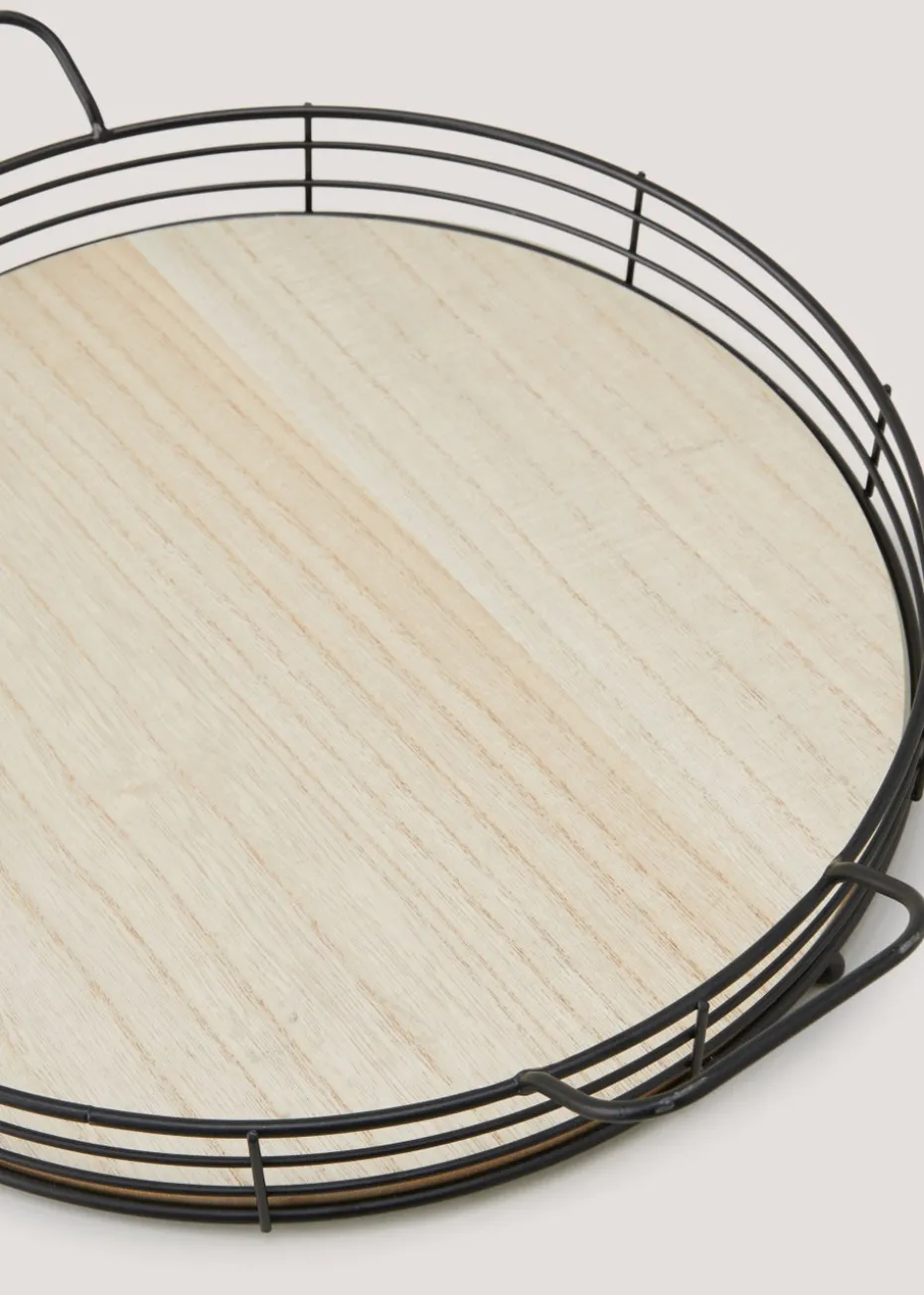 Spruce up your dining collection with this sleek and stylish tray. Featuring a classic round shape, it’s crafted with a black metal wires and a timeless wooden base. Two easy carry handles finish the design. 34.5×4.5