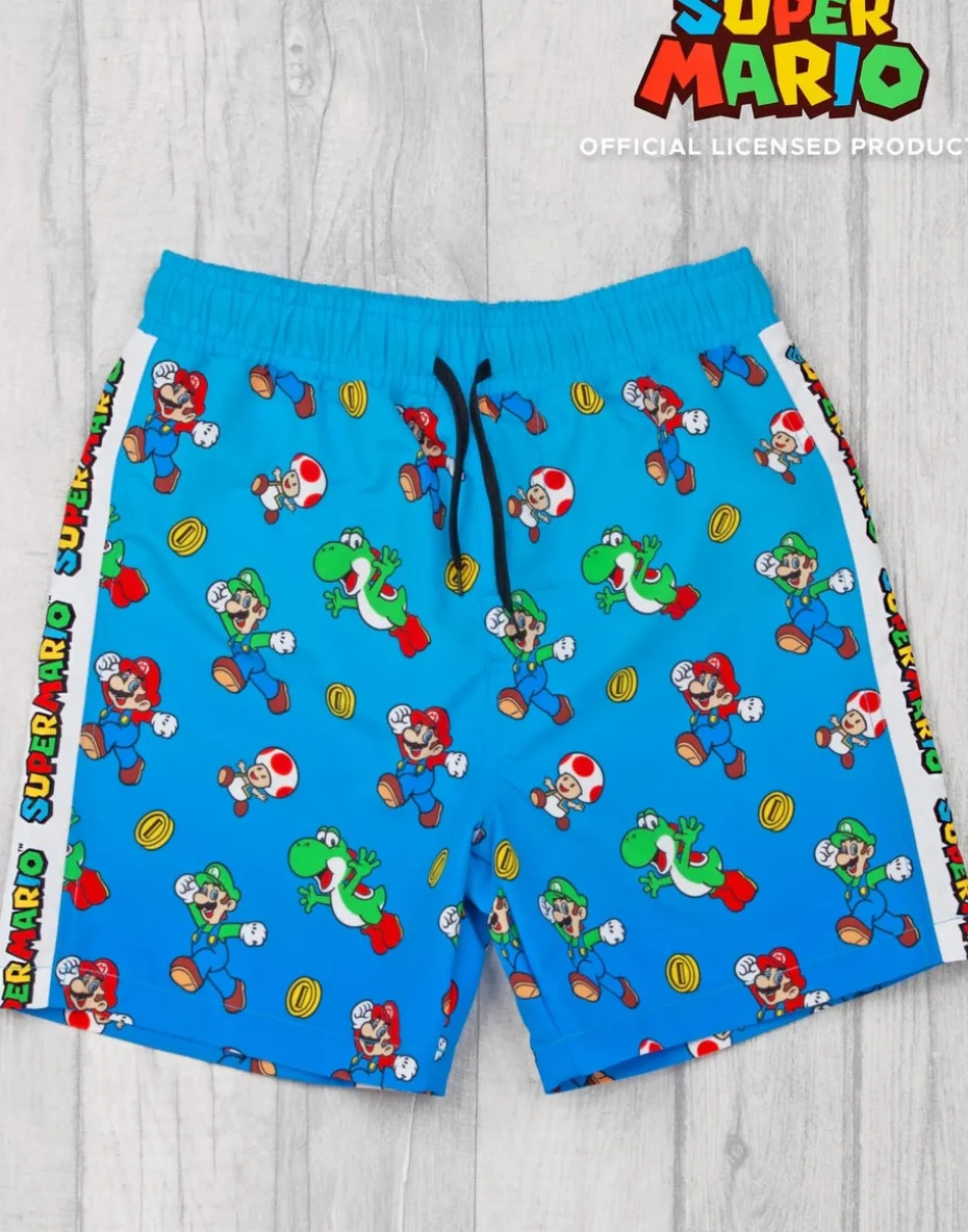 Gamers, level up your swimwear wardrobe in Super Mario style with these cool Mario and Luigi swim shorts for boys; it is perfect for making more fun during swimming, summer vacations, beach and pool days! The Super Mario swimming trunks for kids come in a vibrant blue ombre with an all over print of the game coin with the Mario brothers, Luigi and Super Mario making a must have gift for fans. The boys Luigi and Mario shorts come with awesome white taping detail featuring the popular games logo, Super Mario finishing the gamer swimwear outfit. Perfect for summer adventures & swimming, the Super Mario swim pants for him are made from quick drying polyester with mesh lining inside, these shorts come with a drawstring on the waist making the swim shorts super soft and adjustable for the perfect fit ensuring comfort available in sizes; 3-4 years, 5-6 years, 7-8 years, 9-10 years, 11-2 years and 13-14 years. This item is 100% genuine licensed Super Mario merchandise & features official branding throughout. We want you to get the most out of your new Mario Bros swimwear outfit so please be sure to wash the swimsuit at 40°C, wash with similar colours, wash inside out, rinse well in cold water immediately after use and dry away from direct sunlight and contact our dedicated customer service team for any additional information or sizing queries.