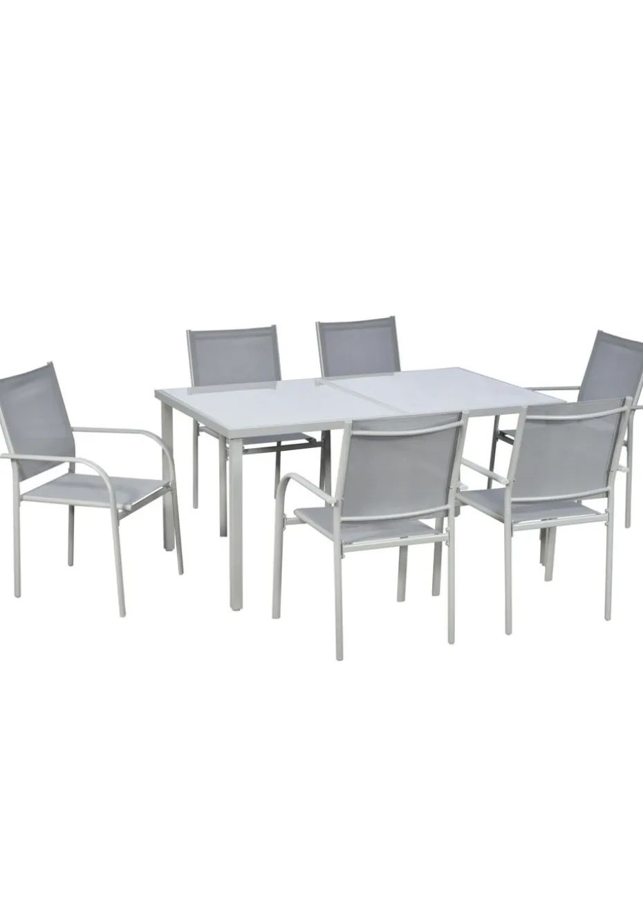 Whether it’s for enjoying your weekend brunch, evening dinner, or catching up with friends, do it with this Outsunny metal garden set. Steel frames mean a strong structure, with mesh fabric on the chairs to allow the skin to breathe. Sleek glass-top table. Bring everyone together in simple style with the outdoor dining set. Colour: Silver Grey Glass, Grey Fabric and Frame Material: Steel, Breathable Mesh, Tempered Glass Table Dimension: 150L x 90W x 72H cm Chair Dimension: 56W x 60D x 87H cm Seat Size: 40W x 47D cm Seat Height: 42 cm Back Size: 45.5L x 48.5W cm Weight Capacity: Chair: 120 kg, Table: 75 kg Item Label: 84G-039V00GY