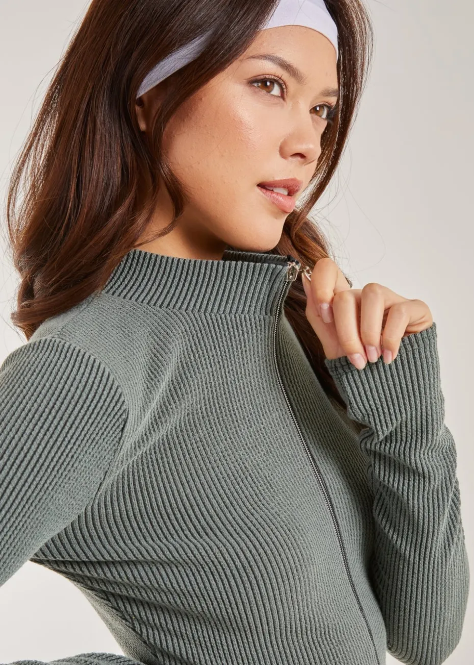 Pink Vanilla Khaki Two Tone Rib Double Zip Top
