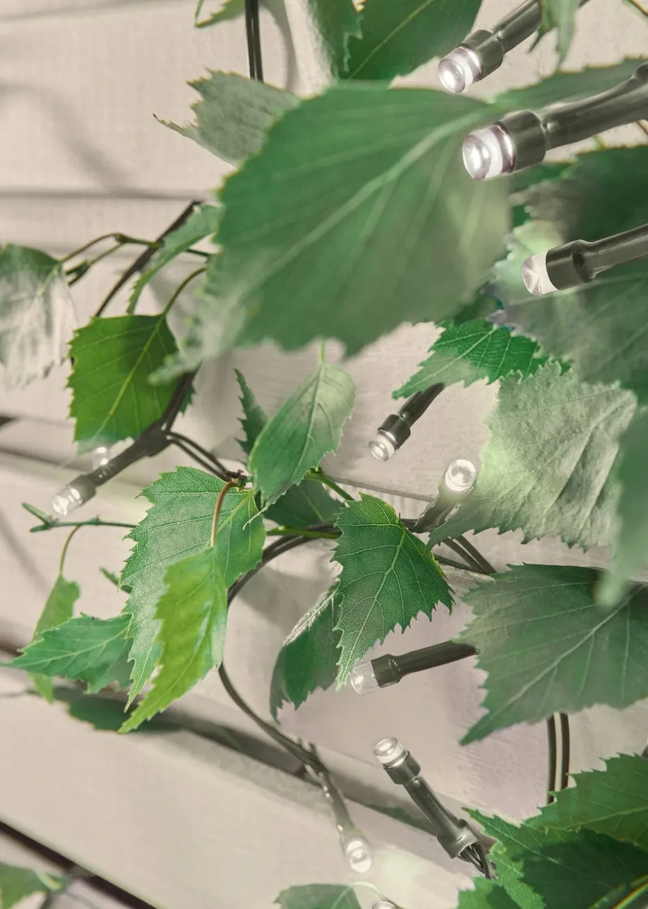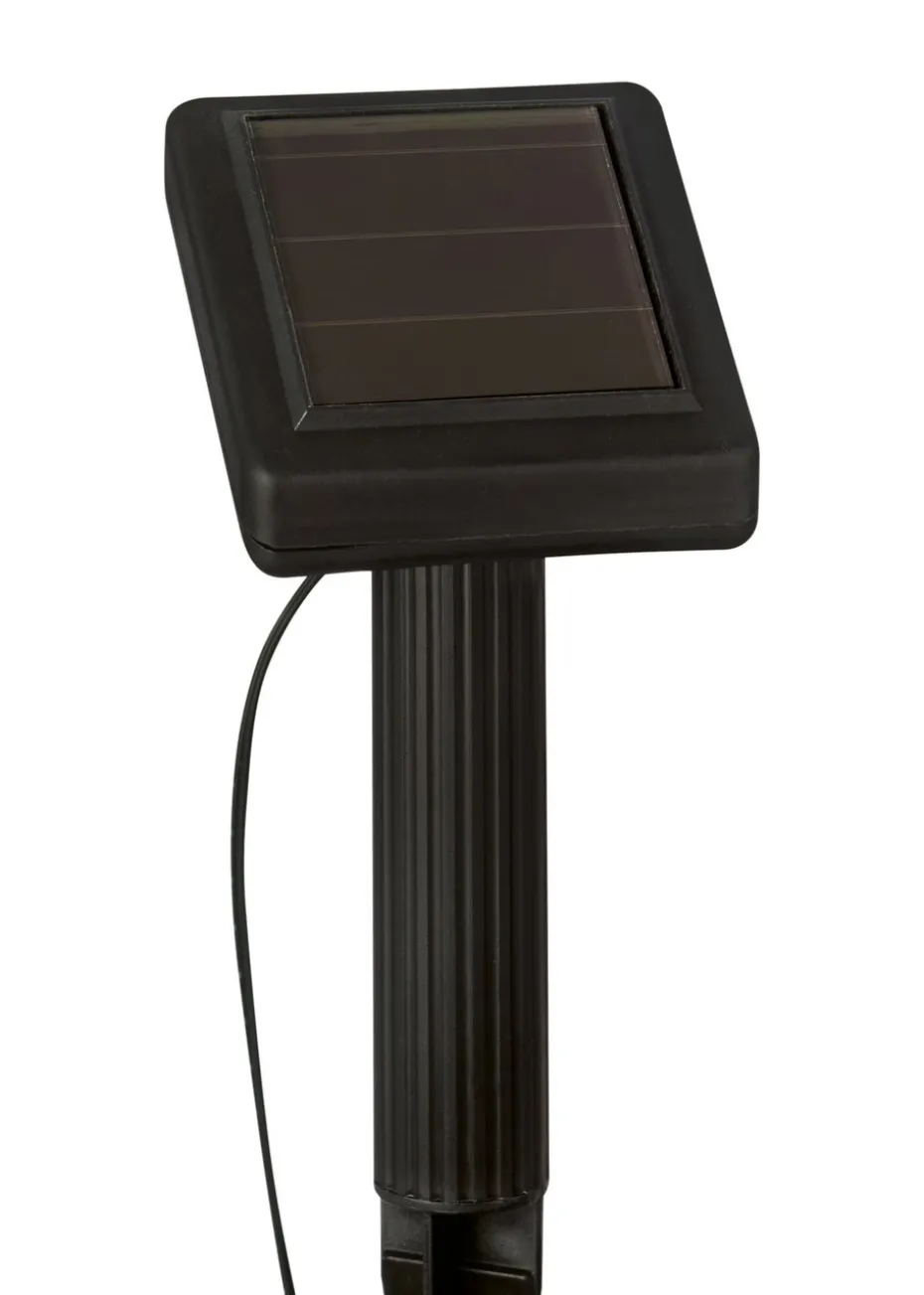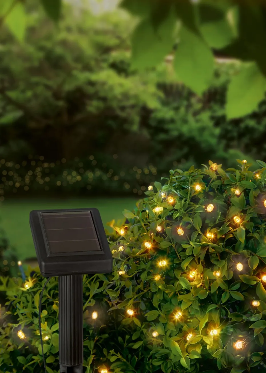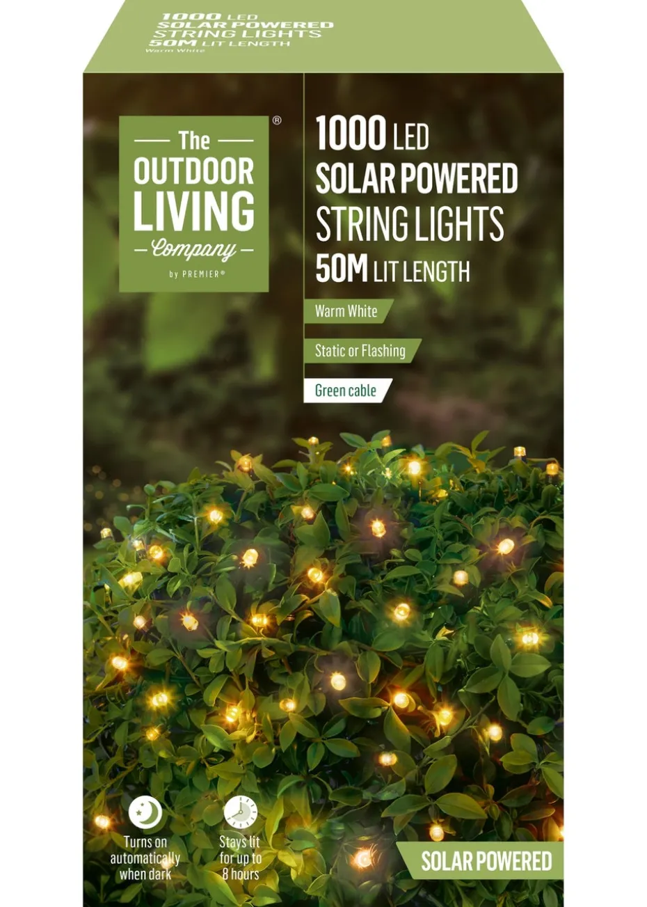 1000 warm white LED solar powered string lights with a 50m lit length on a green cable and a 2m length to the charging panel. Automatically switches on when dark and can stay lit for up to 8 hours. Static or flashing lighting settings.