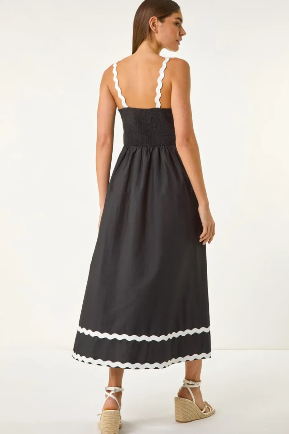 Contrast Ric Rac Midi Dress from Roman. Add a fun and playful touch to your Summer wardrobe with this chic ric rac midi dress. Featuring cute strappy sleeves and a midi length, this dress is adorned with a contrasting ric rac design that adds a whimsical charm. Perfect for sunny days, style this dress with sandals and a denim jacket for a laid-back yet stylish look that is perfect for any casual outing!