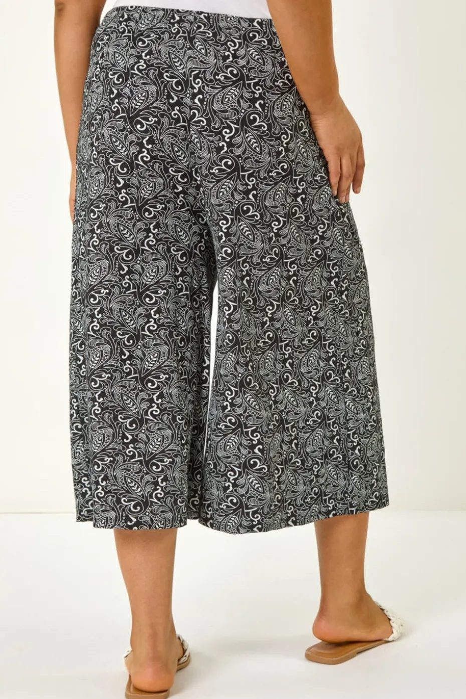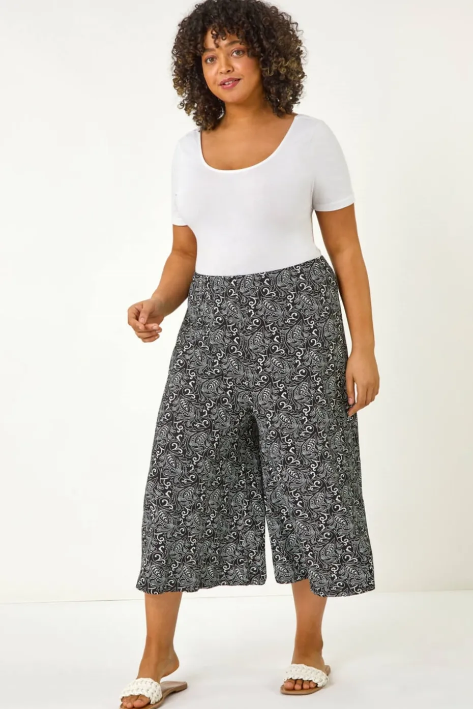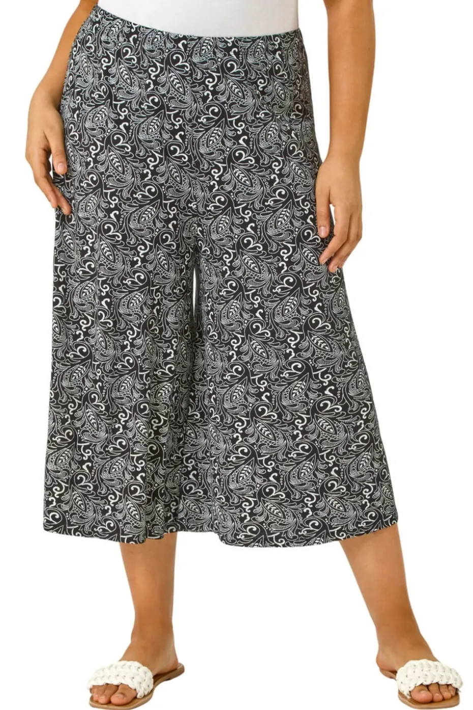 Curve Abstract Print Culottes from Roman. Embrace your Curves in style with these abstract print culottes this Spring Summer. Featuring a striking abstract paisley print, these culottes are designed with an elasticated waistband and stretch jersey fabric for easy pull-on wear. The wide-leg at culotte length adds a trendy touch to your outfit. Style them with a white blouse and wedge sandals and you’re all set for the day!