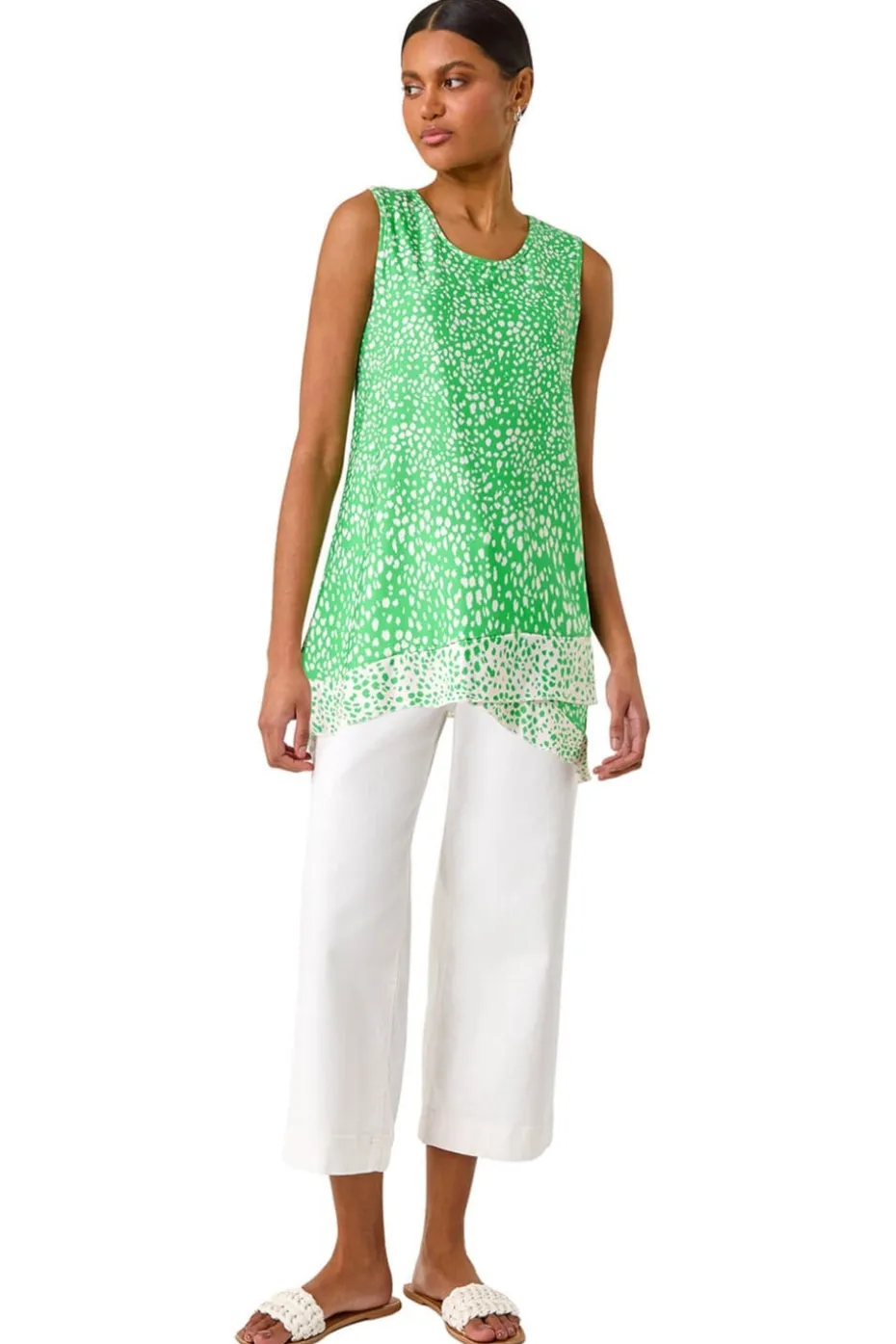 Spot Print Asymmetric Vest Top from Roman. This stylish all over printed vest is designed with a flattering asymmetric hem for a modern touch. Featuring a classic round neckline and a sleeveless silhouette, it offers a comfortable and breezy fit. Finishing at the hips, this versatile piece is perfect for layering or wearing on its own with jeans or shorts for a chic, effortless look.