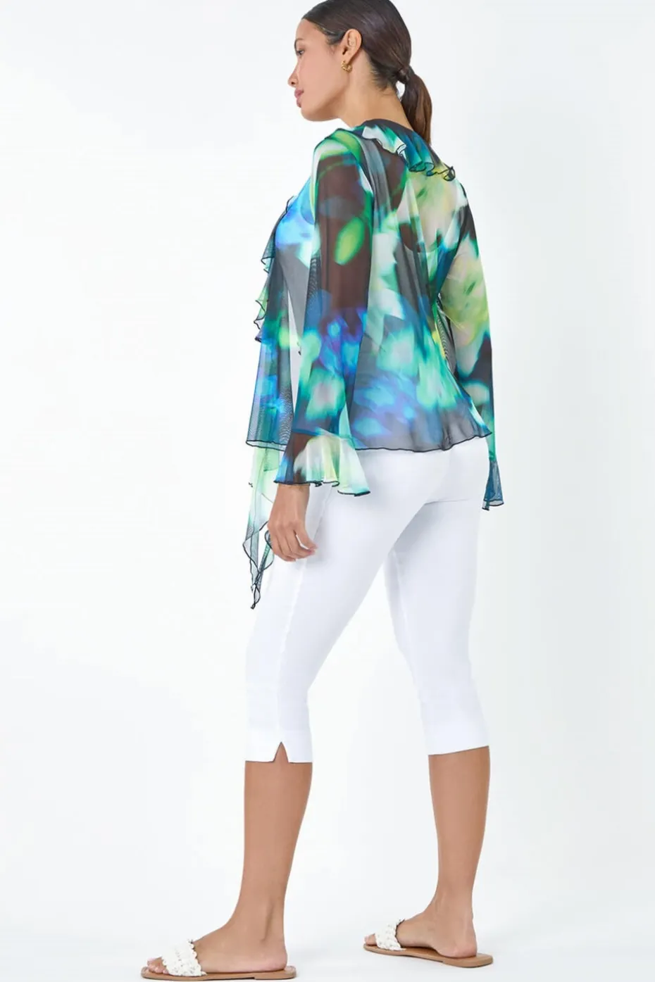 Tie Frill Detail V-Neck Stretch Mesh Top from Roman. Get ready for those warmer months with this stylish stretch mesh ruffle top. The v-neck design and long sleeves with frill cuffs add a touch of femininity, while the hip-length silhouette provides a flattering fit. This versatile piece features a chic tie fastening at the hem, making it perfect for layering over a cami top. Crafted from abstract printed mesh fabric, it’s a staple cover-up for your Spring Summer wardrobe. Pair with a vest and cropped trousers to seamlessly transition from day to night, at any occasion!
