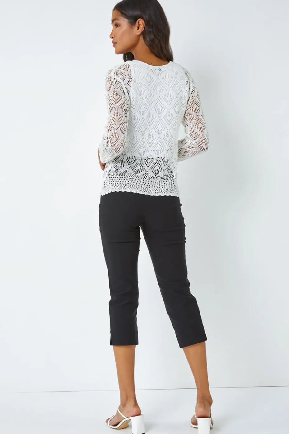 Knitted Crochet Shimmer Shrug from Roman. The perfect delicate cover up for layering on cool Summer evenings, or to complete a Wedding outfit. This piece is cut from a light weight, knitted shimmer fabric. It features a feminine v neckline when closed and boasts intricate trim detail. A delicate crochet pattern creates interest and allows the garment underneath to be shown. Its 3/4 sleeves ensure a light and cool feel. Pair with cropped jeans and sandals for a relaxed feel or throw over occasion dresses to complete your look!