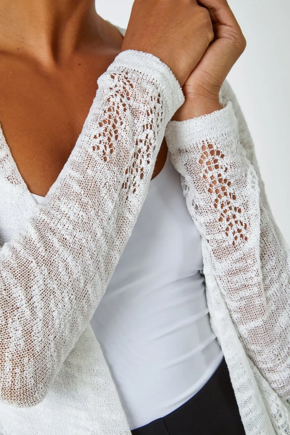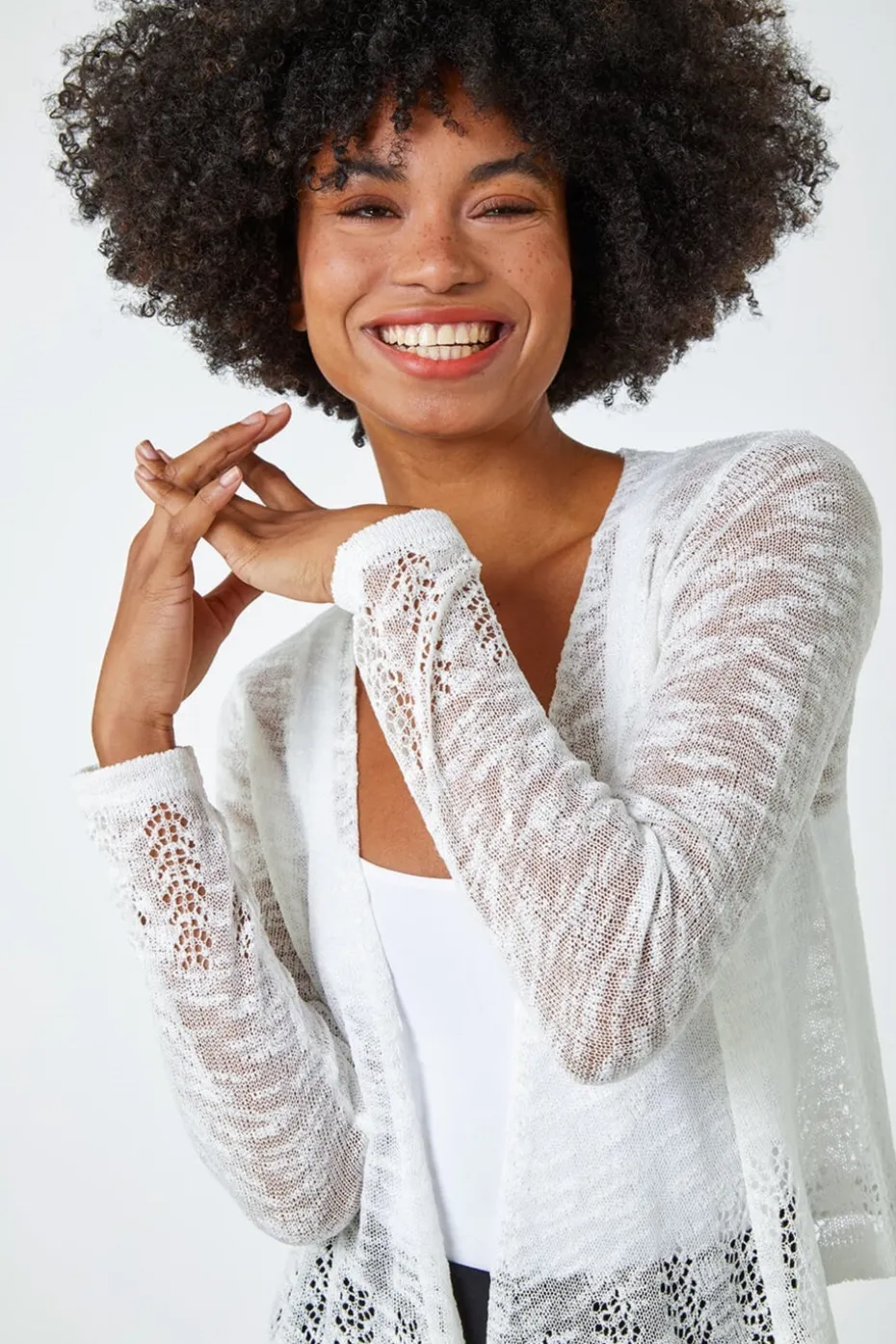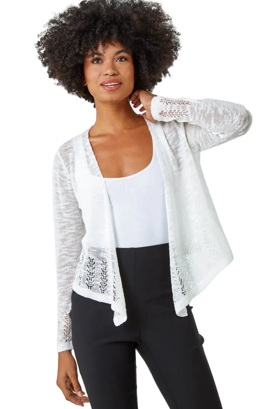 Lightweight Knitted Shrug from Roman. Lightweight layers are essential during the warmer months and this knitted shrug is perfect for just that. Cut from a light, knitted fabric this piece is designed in a unique, drop needle style, creating texture and interest throughout the piece. It features a luxurious edge to edge, draped open front and full length sleeves. Its finished with intricate pointelle detail at the hem. Throw over casual Summer outfits or layer up with your occasion dresses for an added layer!