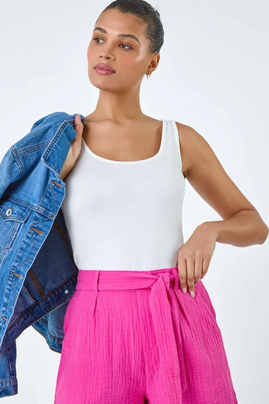 Plain Stretch Jersey Vest Top from Roman. Embrace the sunny season with our Summer outfit must-have! This versatile vest top is crafted from stretch jersey fabric for ultimate all-day comfort. Effortlessly stylish, this top promises to elevate your wardrobe with its chic simplicity, sleeveless body and flattering scoop neckline. A real suitcase staple, this vest offers endless possibilities for creating casual looks all season long. Get holiday ready with the addition of denim shorts and sandals or add culottes and a woven shirt for easy transitional dressing.