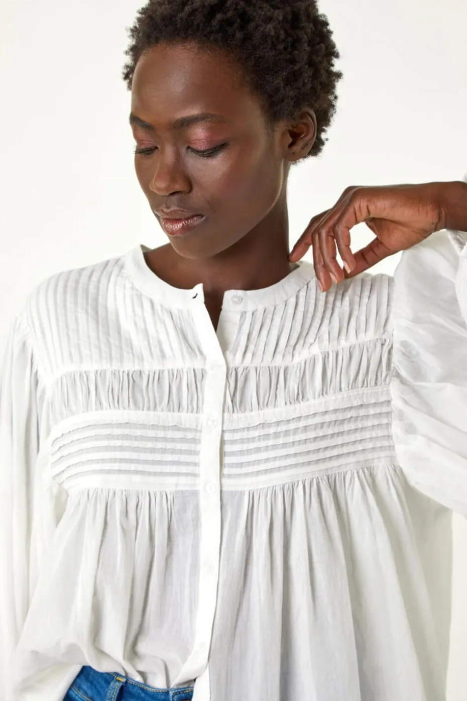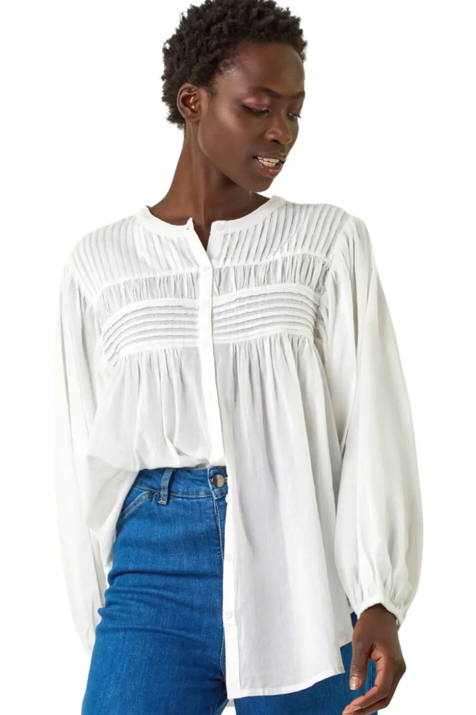 Pleat Detail Button Through Blouse from Roman. Add a touch of sophistication to your wardrobe with this pleat detail button-through blouse. Crafted from a soft cotton fabric, this classic round neckline design features long sleeves to keep you warm during the Autumn Winter. Complete with stylish front pleat detail and trendy button-through opening, this blouse adds a subtle elegance to your outfit. Style effortlessly with jeggings and ankle boots for a complete fall look!