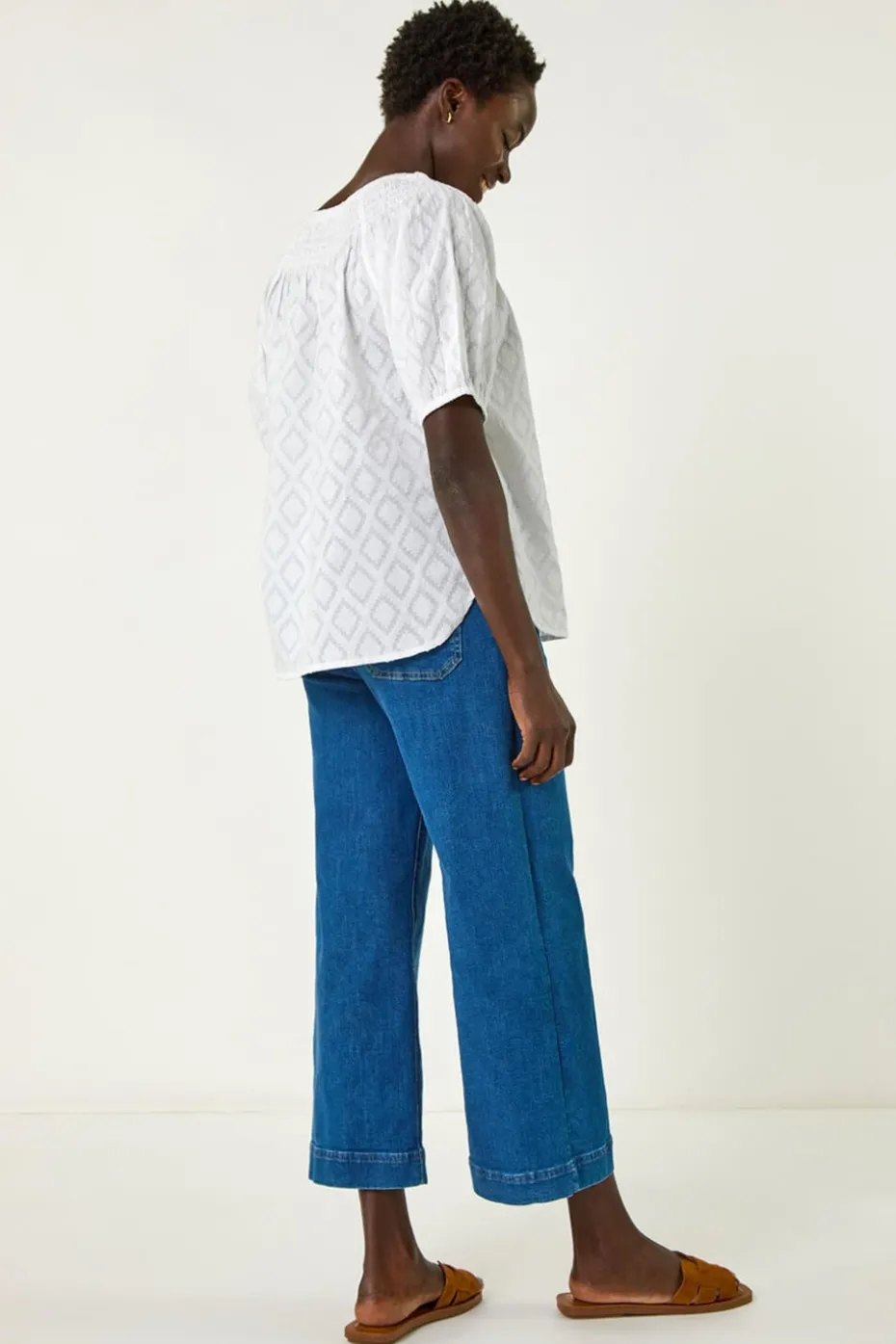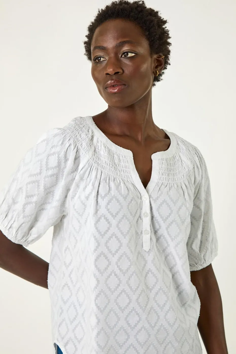 Shirred Neck Textured Top from Roman. Add a touch of elegance to your everyday style with this top crafted from all-over textured fabric. Featuring a shirred round neckline with delicate button detailing, it’s designed with short sleeves and elasticated cuffs for a comfortable yet polished look. Pair it with jeans and sandals for a versatile outfit that’s effortlessly chic!
