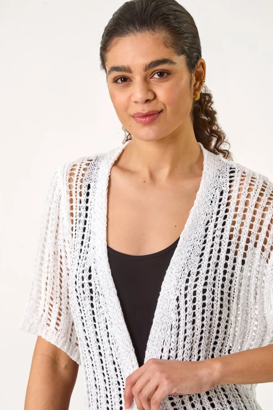 Stitch Short Sleeve Knit Cardigan from Roman. Unwind in style with this delightful stitch knit cardigan. Ensuring ultimate comfort, this soft knitted piece features an edge to edge opening with charming 3/4 sleeves and intricate pointelle details. Crafted from a mix of fabrics, it finishes in a classic cardigan shape, perfect for layering over your favourite shirt and pairing with trainers for a laid-back casual look this Spring Summer.