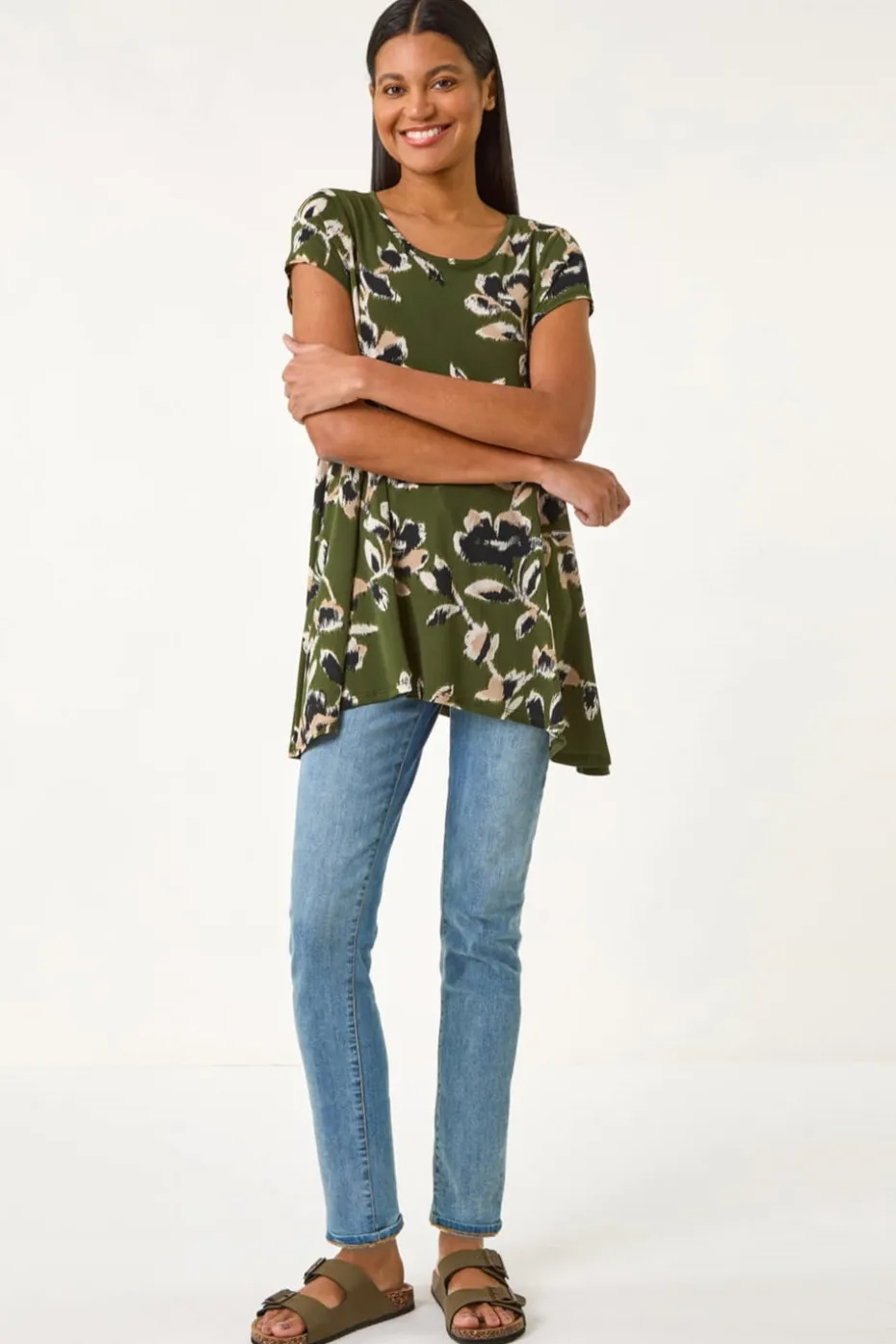 Leaf Print Hanky Hem Tunic Top from Roman. Feel the vibrant vibes of Spring Summer in this leaf print hanky hem tunic top. Embrace the flattering round neckline and short sleeves crafted from a stretchy jersey fabric. Adorned with an abstract leaf pattern, this top flows beautifully in a tunic shape, finishing with a unique hanky hem. For a complete look, style with a denim jacket and jeggings for a fabulous outfit!