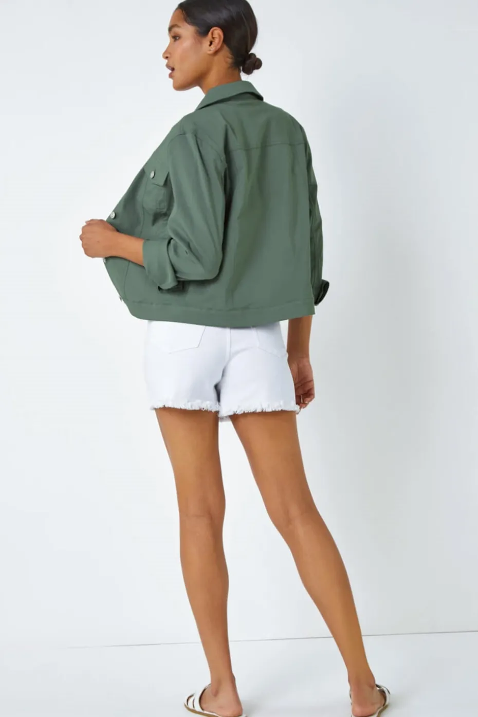 Stretch Pocket Detail Jacket from Roman. A classic jacket style with a comfortable twist, this piece is crafted from our favourite bengaline fabric. Boasting all the details you’d expect from a jean jacket: a smart collar, patch pockets and fully open button front, this jacket is finished with full length sleeves with cuffs. Designed in an on trend colour this can be worn styled in a multitude of ways; with printed dresses, denim shorts or the matching skirts – wear this with ease throughout Spring & Summer!