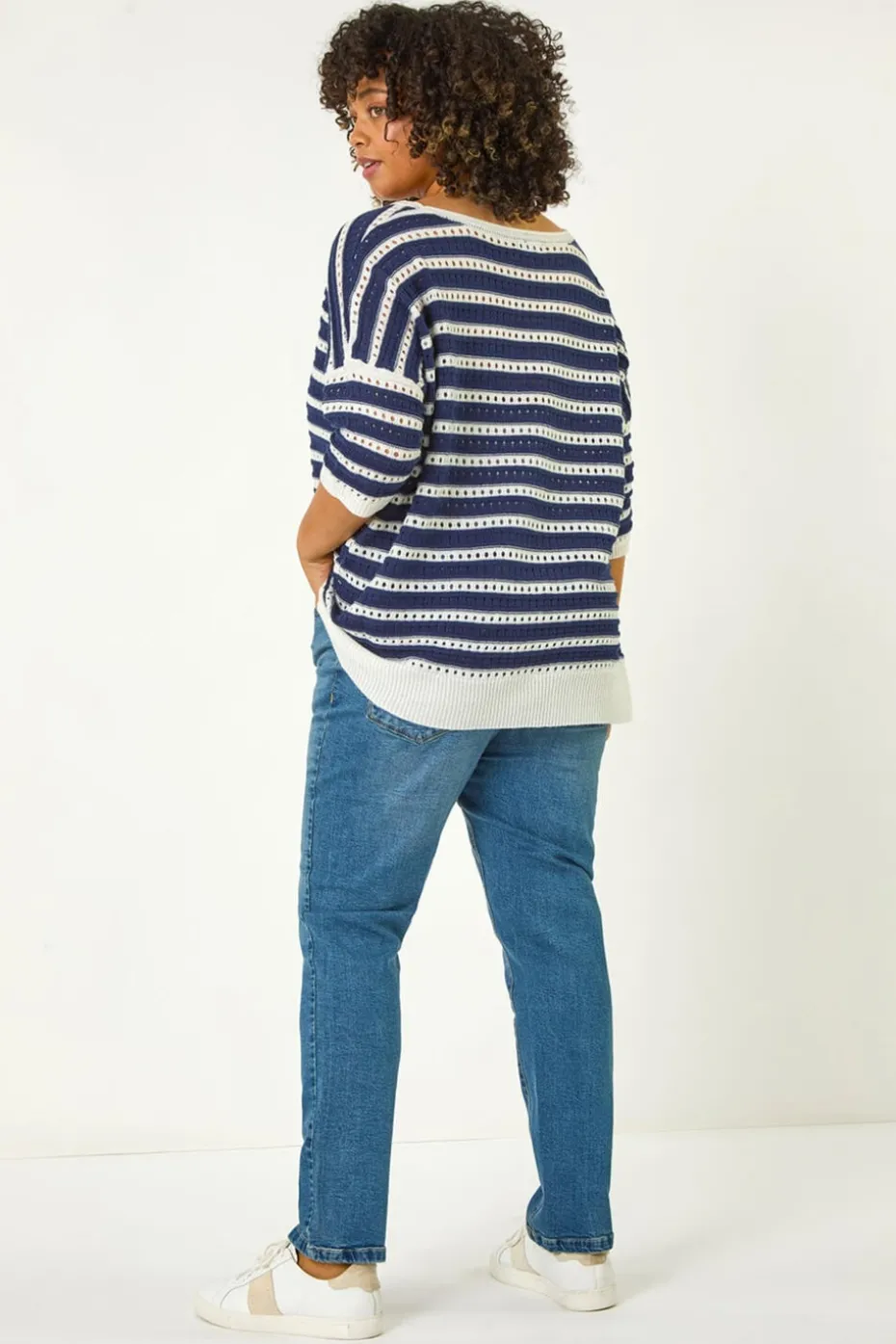 Curve Crochet Stripe Knit Top from Roman. Add a touch of elegance to your Spring Summer wardrobe with this effortlessly stylish Curve crochet knit top. The classic round neckline and short sleeves make it a versatile piece for any occasion, crafted from soft knitted fabrics for easy overhead wear. Stand out with the contrast crochet stripe print. Pair it with wide-leg trousers and a jacket for a complete look that will turn heads wherever you go!