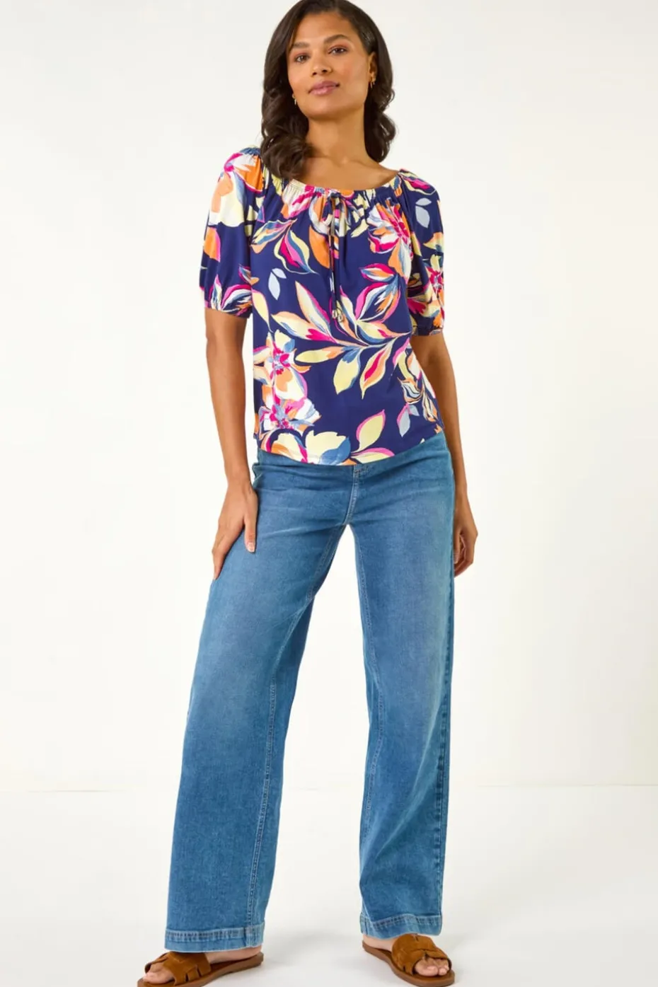 Floral Print Bardot Stretch Top from Roman. Feel the floral fantasy in this vibrant bardot top. Featuring a bold and striking floral print, this top showcases a flattering bardot neckline with a front tie detail. The elasticated short sleeves add a touch of comfort and style. Crafted from stretch jersey fabric, this top guarantees a fabulous fit. Pair with a denim jacket and jeggings for a stylish Spring Summer look!