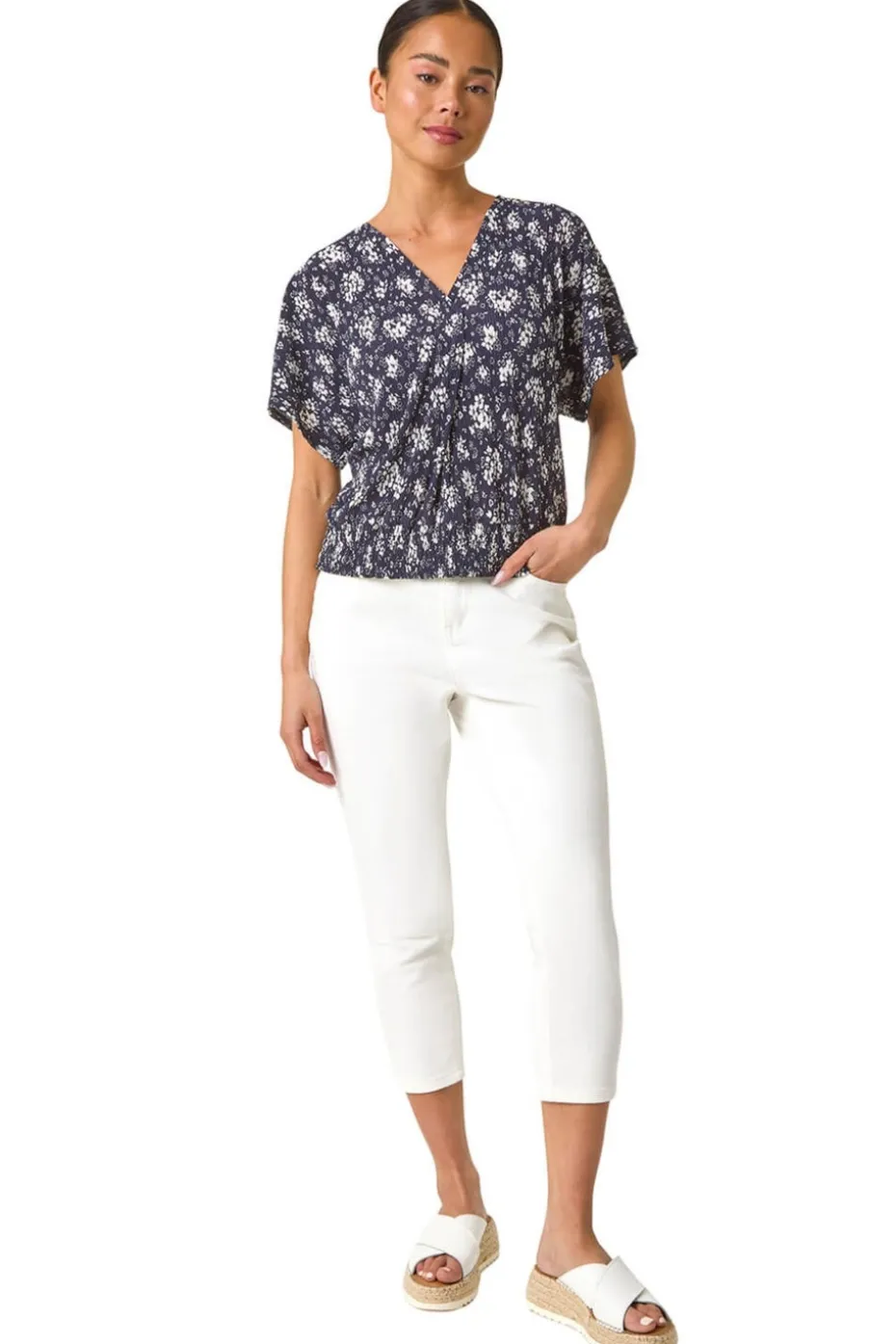 Petite Floral Print Crinkle Blouson Top from Roman. Effortlessly elegant and perfectly Petite, this floral print top is a must-have for the Spring Summer season. Designed with a feminine v-neckline and lovely short sleeves, this top is crafted from a soft stretch plisse fabric with a beautiful blooming floral print and delicate crinkle detail. Completed with a flattering blouson elasticated hem that adds a touch of charm. Pair with linen trousers and sandals for a sophisticated and stylish outfit.