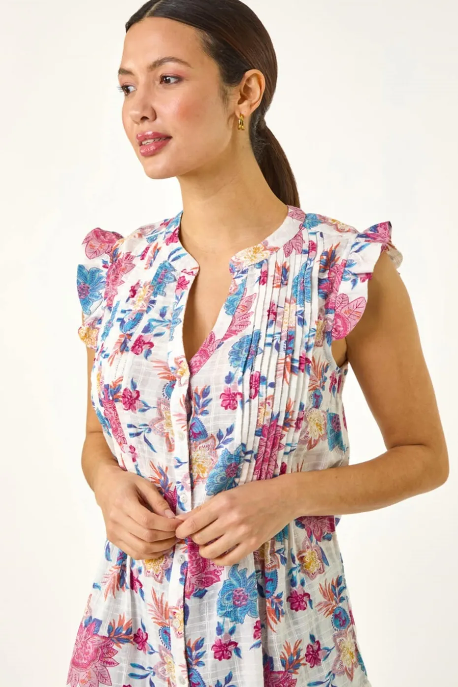 Floral Print Pintuck Frill Blouse from Roman. Get into the Spring Summer spirit with this charming floral print blouse. The sleeveless style boasts frill cap sleeves and a notch v-neckline, perfect for warmer days. Cut from a soft cotton fabric with a stunning floral print, front button details, and delicate pintuck pleats for added texture. This pretty piece is finished in a blouse shape, ideal for pairing with a denim jacket and jeggings for a complete look.