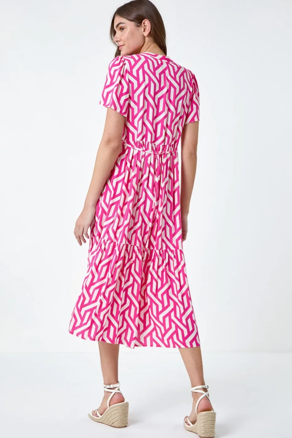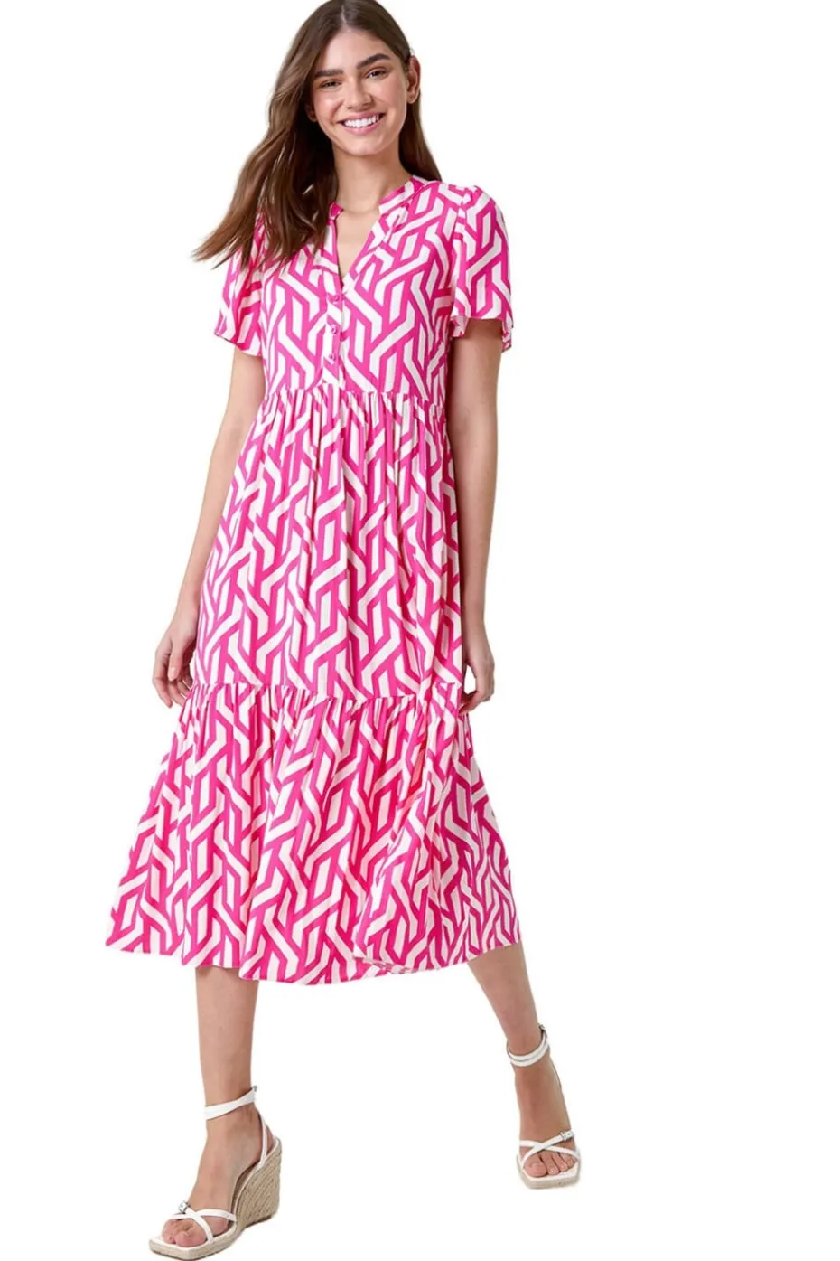 Geometric Print Tiered Midi Dress from Roman. Feel fabulous in this statement geometric print midi dress this season. Showcasing a stylish v-neckline, short sleeves, and button detailing on the bodice, this tie waist dress boasts a charming frilled and tiered skirt for added flair. Crafted from a light woven material in a flattering midi length, it offers a perfect choice for your Spring casual days. Complete the look with heeled wedges and a denim jacket for effortless daywear at home or on holiday this Summer!