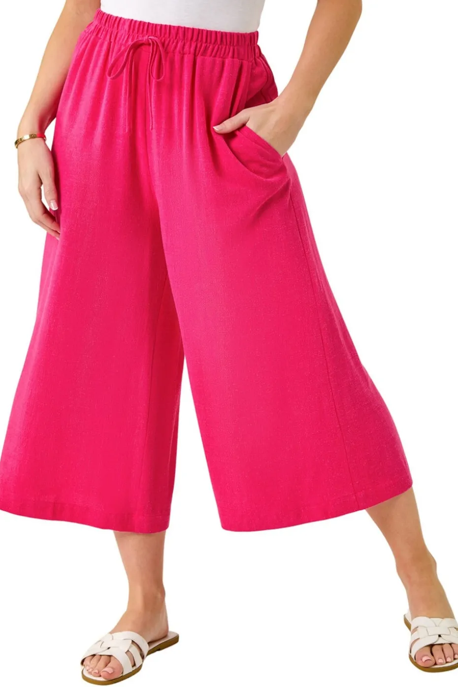 Petite Elasticated Waist Linen Mix Culotte from Roman. Discover ultimate comfort and style with these smart Petite linen culottes. Crafted from a lightweight woven linen mix fabric, these culottes feature a trendy and practical elasticated waistband with drawstring detail. They also come with convenient angled side pockets at the perfect placement. Pair with a smart top and blazer for a sophisticated and put-together look that will take you from day to night effortlessly!