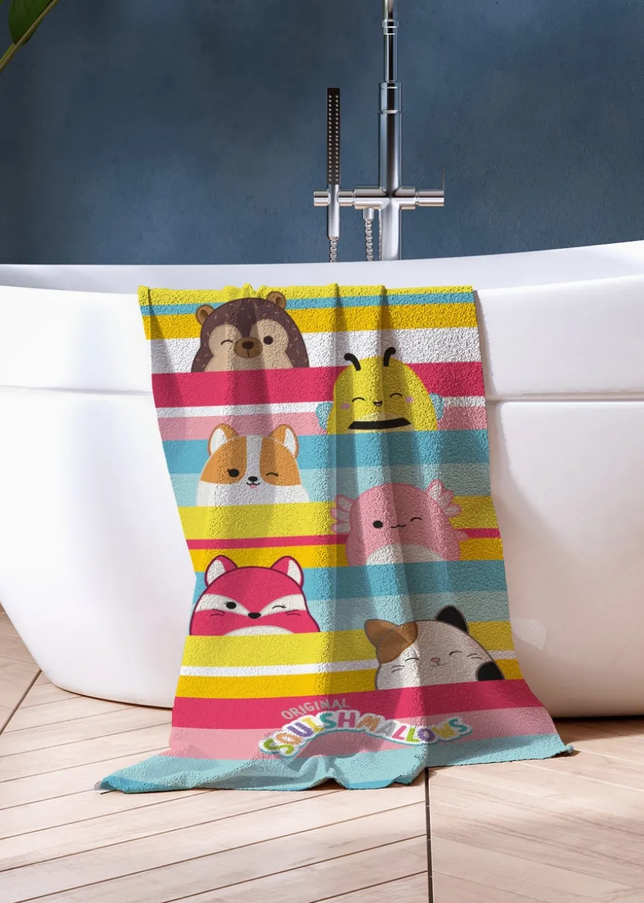 Featuring an array of colorful and cute Squishmallow characters, the design is vibrant and engaging, sure to delight children and Squishmallows collectors alike. The playful pattern brings the joy and whimsy of Squishmallows to life, making drying off a fun and enjoyable experience.