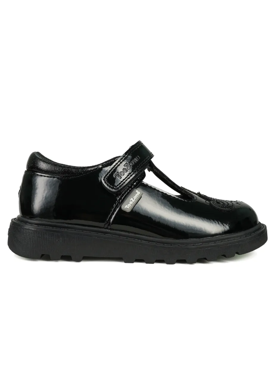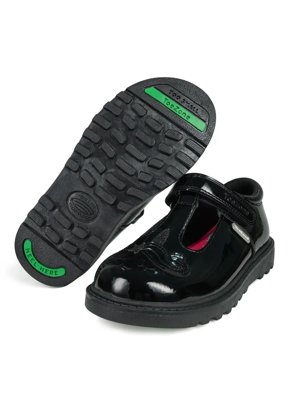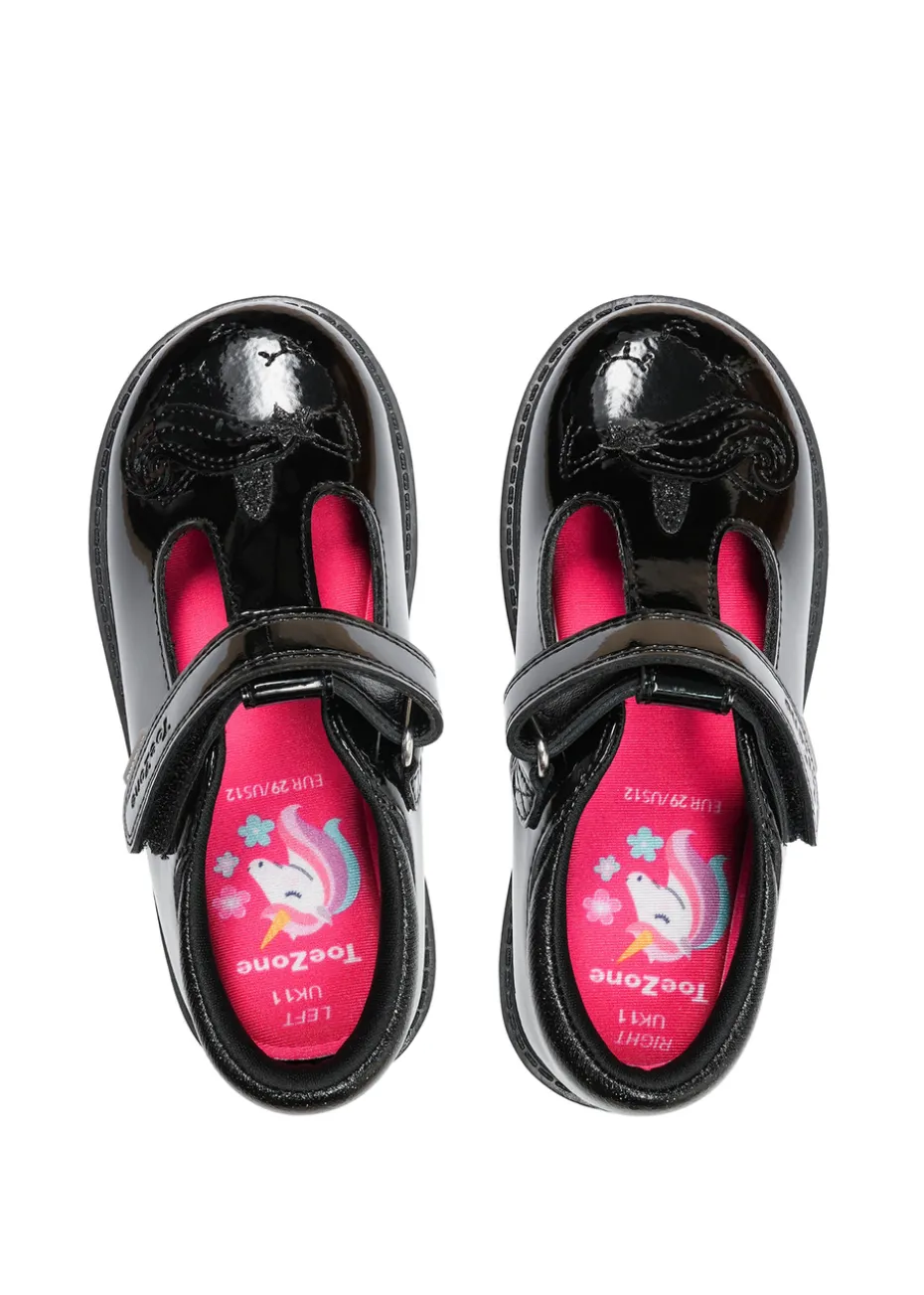 ToeZone Black Ellie Patent Coated Leather Rip Tape Unicorn School Shoe (Younger 8- Older 3)
