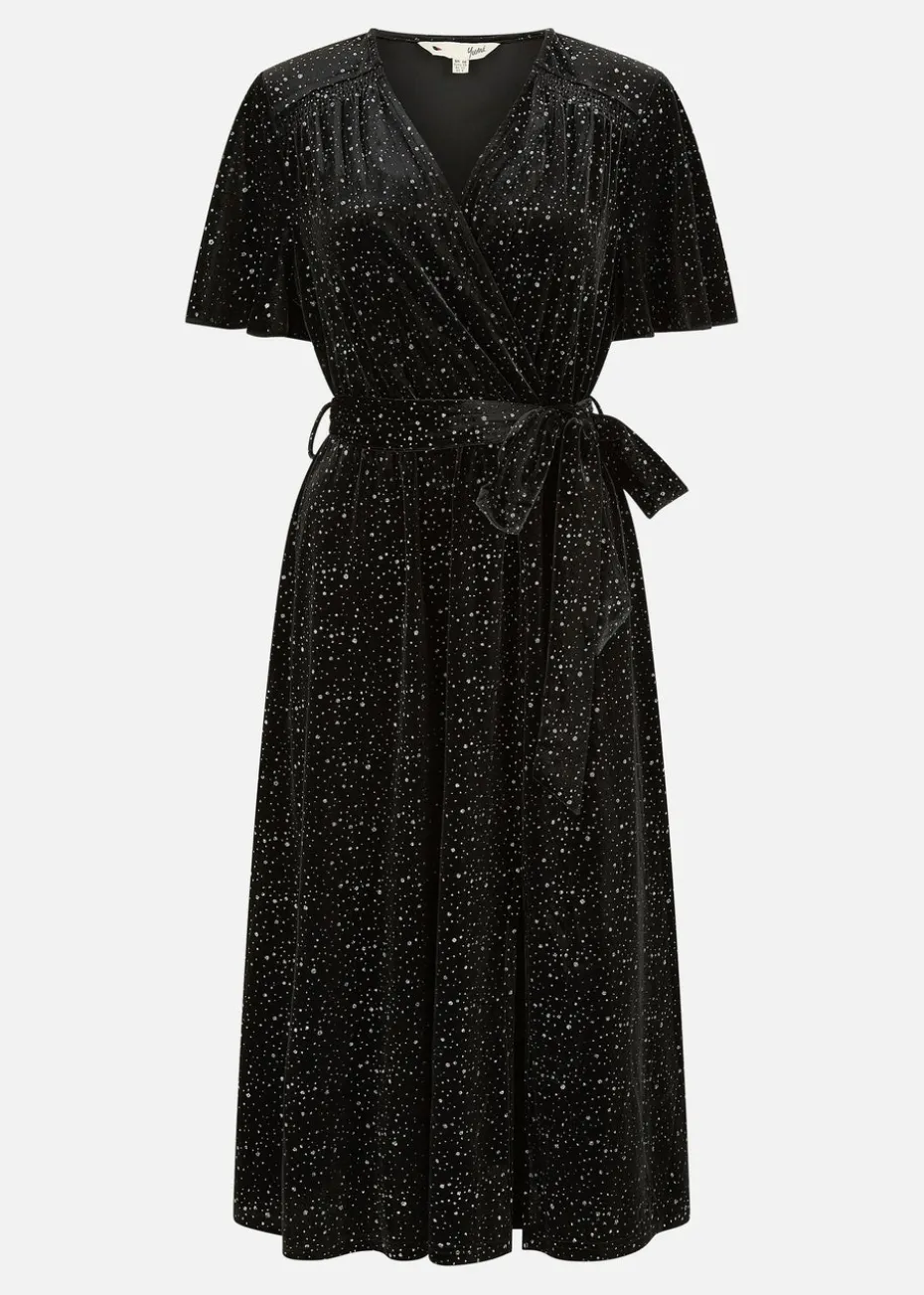 Sparkle like the night sky in this luxurious velvet wrap dress from Yumi, The all over shimmer looks incredible on the super flattering shape. With a midi length hem, tie belt at the waist and soft fluttery angel sleeves. We are obsessed with this for winter weddings, or Christmas parties.