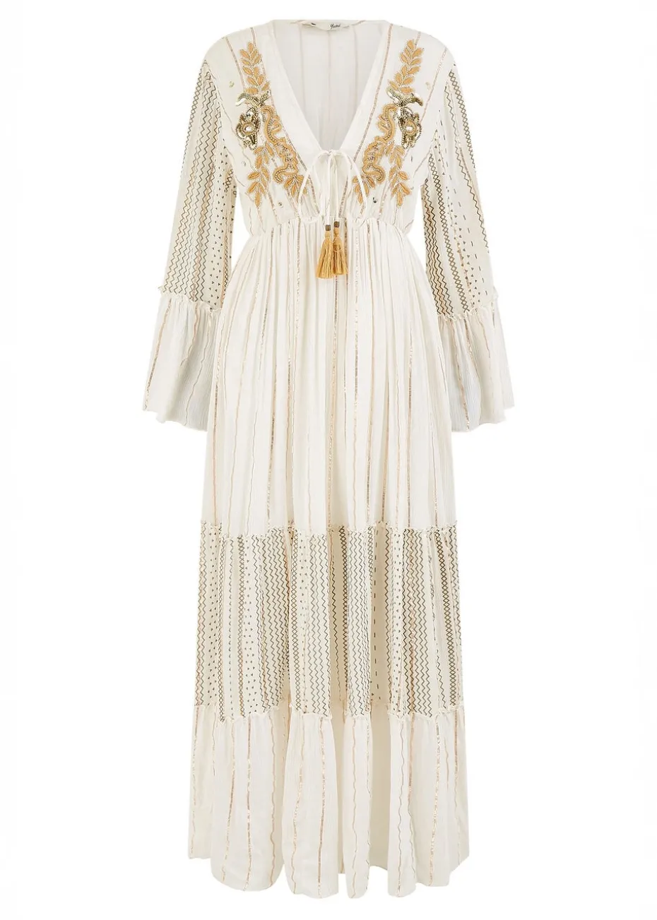 Metallic details, flowing sleeves, tied neckline and beaded embroidery. This maxi dress has it all. A design like this deserves to be worn in the sunshine and would look perfectly at home at any resort. The maxi length in a viscose fabric ensures you’ll be comfortable and cool in all climates. The tiered look is highlighted with striped stitching, we love this worn with a sandal and oversize Sunnie’s to complete the look.